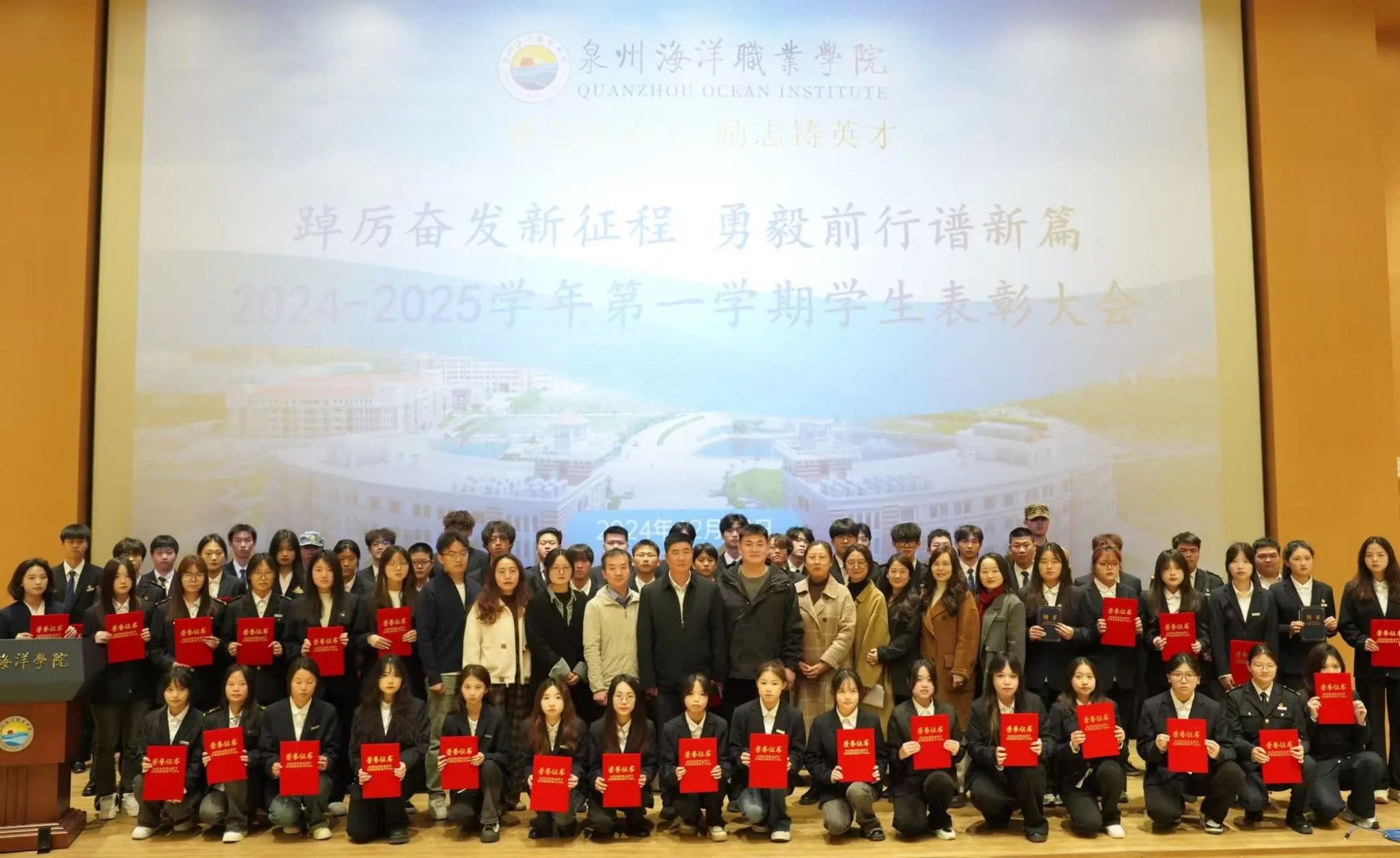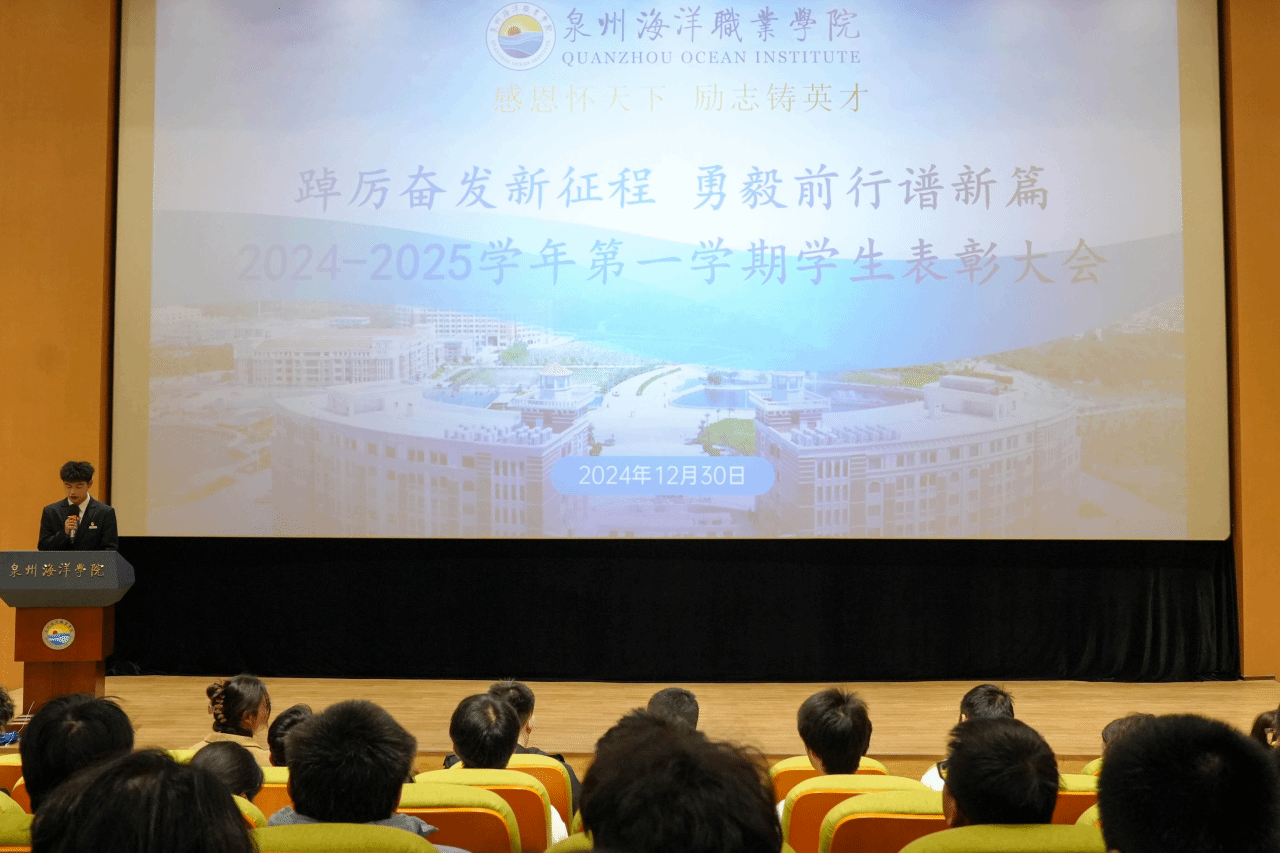 2024年12月31日,泉州海洋职业学院党委学工部联合校团委于图书馆报告厅举行了2024-2025学年第一学期学生表彰大会。本次表彰大会的召开不仅是对过去一学期同学们辛勤付出与卓越成就的见证,更为新的一年工作的开展奏响了激昂奋进的序曲。党委学工部部长张君,党委学工部副部长、校团委书记余斐虎,党委学工部全体老师以及100余名团学组织学生代表齐聚一堂,共同见证了这一荣耀时刻。