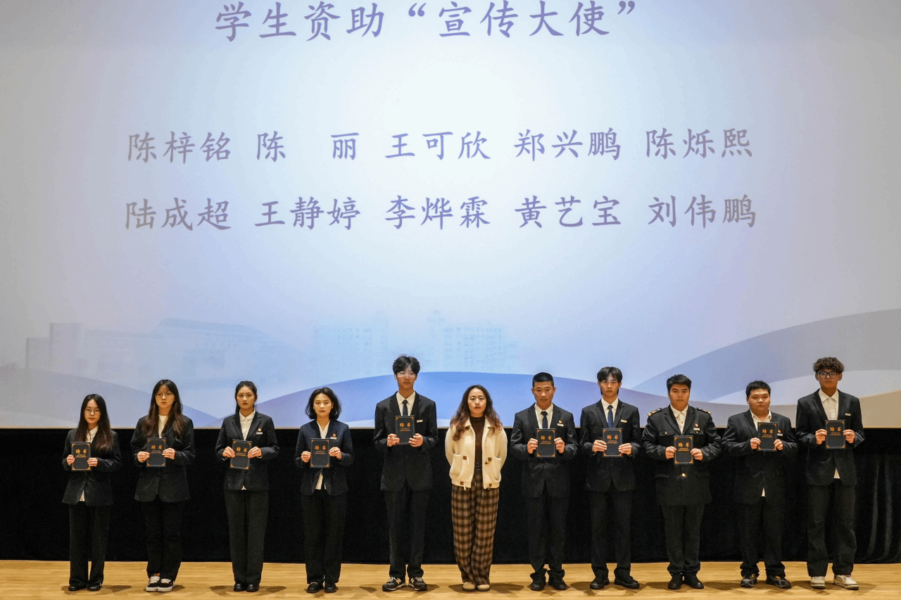 资助与捐赠中心副主任温宝林为陈梓铭、陈丽、王可欣等10名学生资助“宣传大使”颁发聘书,他们将肩负起宣传学生资助政策的重任,帮助更多同学了解和获得资助。