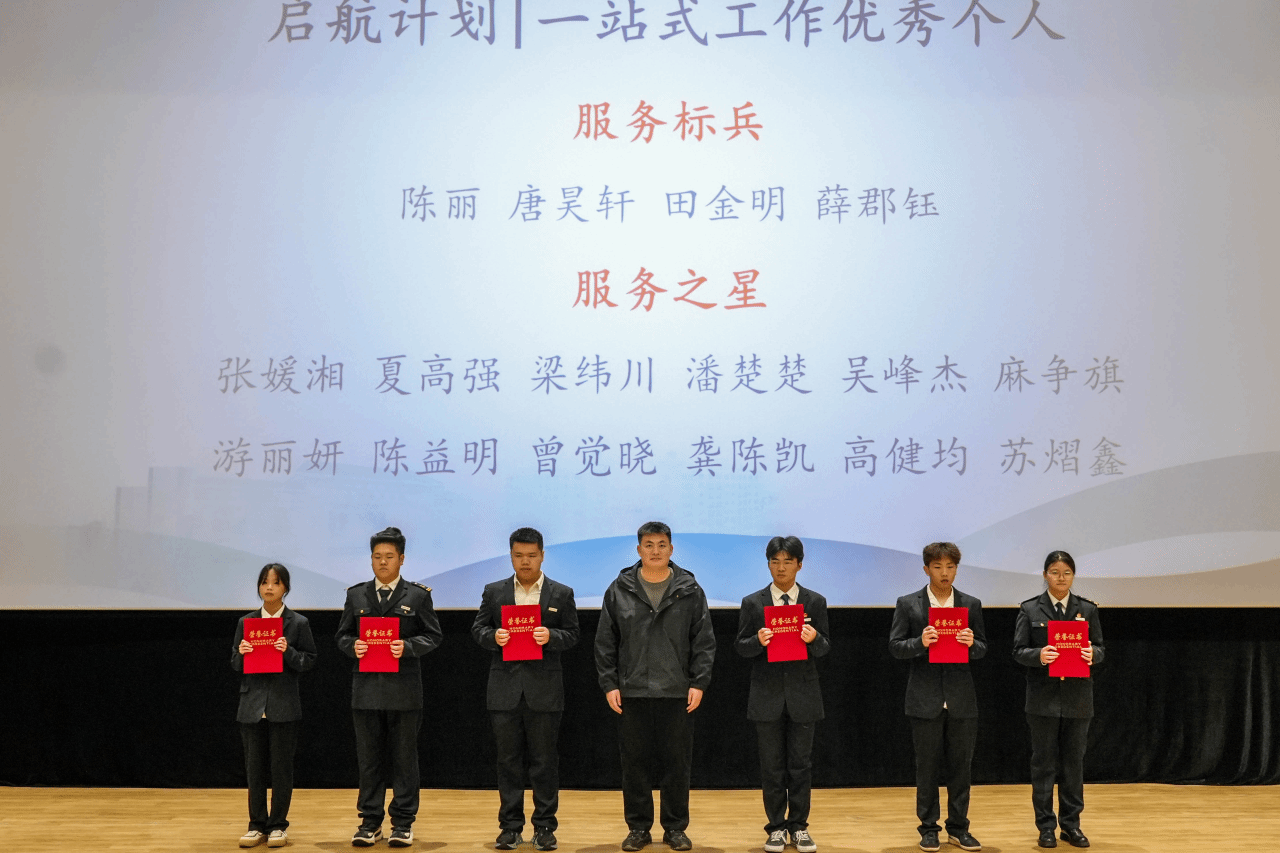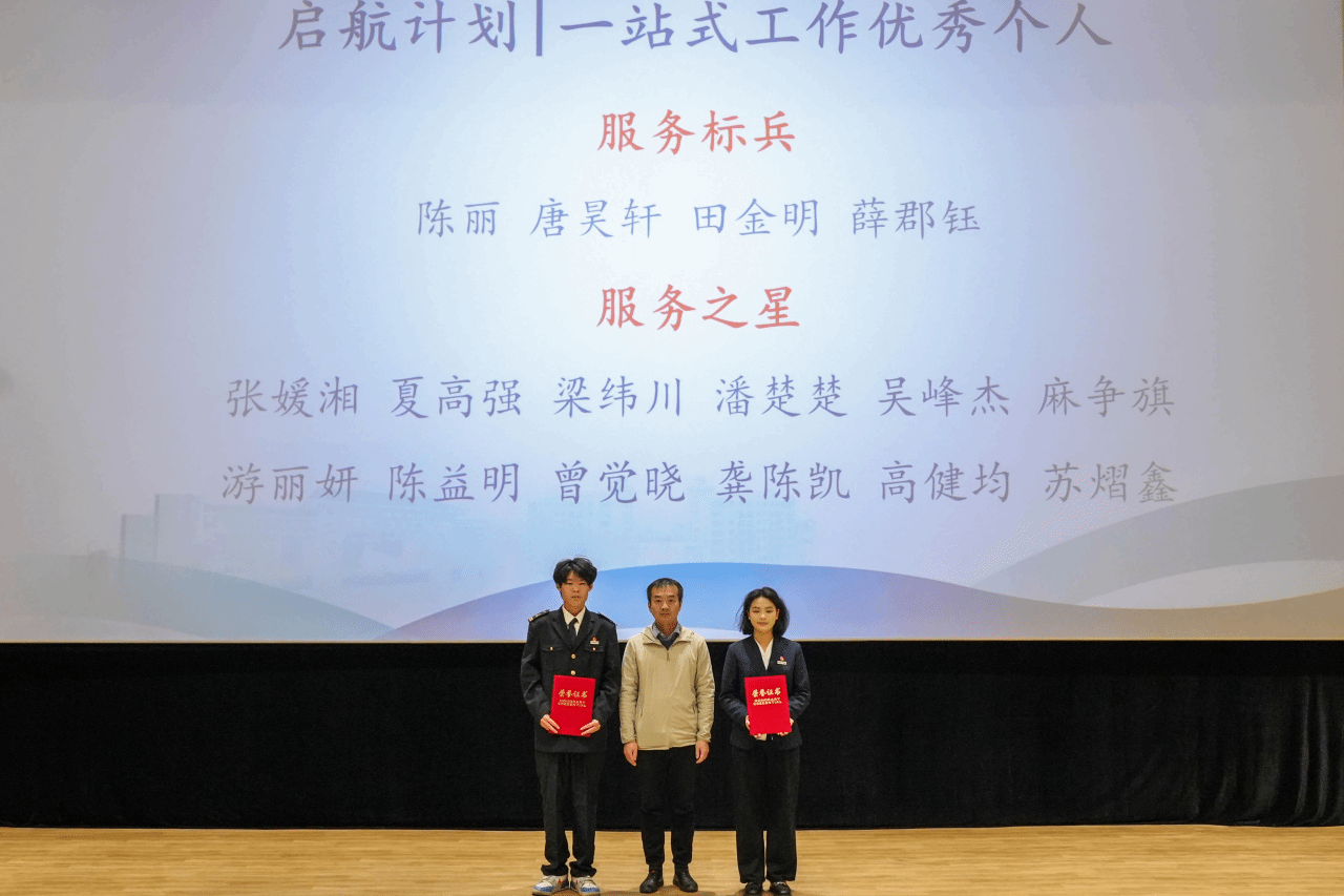 启航计划|一站式工作的“服务之星”及“服务标兵”奖也相继颁发。党委学工部副部长、校团委书记余斐虎为陈丽、田金明两位“服务标兵”代表颁奖,校团委副书记肖伟强和党委学工部办公室副主任林淑婷分别为两批“服务之星”颁奖,他们在一站式工作中默默奉献,为同学们提供了优质的服务。
