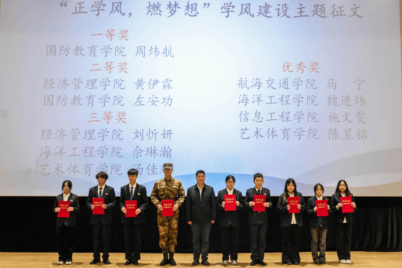 在颁奖环节,党委学工部部长张君为“正学风,燃梦想”学风建设主题征文比赛中获得一二三等奖及优秀奖的周炜航、黄伊霖、左安功等10名同学颁奖。他们用文字展现了对学风建设的深刻理解和积极践行。