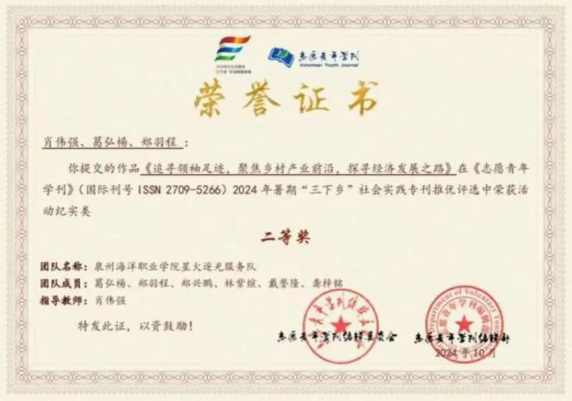 * 泉州海洋职业学院“星火逐光”服务队作品刊登《志愿青年学刊》,专刊推优评选荣获二等奖