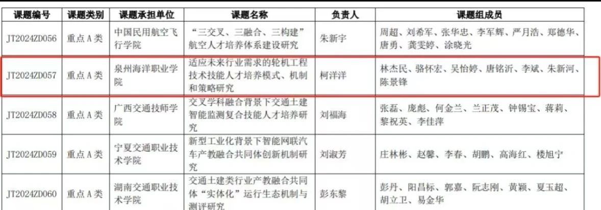 11 月 19 日,中国交通教育研究会公布了 2024-2026 年度交通教育科学研究课题立项结果。经评审,共立项课题 588 项(重大课题 3 项、重点课题 100 项(A 类 60 项 B 类 40 项)、一般课题 485 项)。其中,泉州海洋职业学院海洋工程学院柯洋洋与团队成员林杰民、骆怀宏、吴怡婷、唐铭沂、李斌、朱新河、陈景锋报送的课题《适应未来行业需求的轮机工程技术技能人才培养模式、机制和策略研究》成功获批重点 A 类课题立项。海洋工程学院将继续秉承“以研促教、以教促学”的教育理念,通过课题研究推动教育教学改革,为实现教育现代化和交通强国战略目标做出更大贡献。在未来,学院将不断探索和创新,致力于培养适应未来行业需求的轮机工程技术技能人才,以确保教育成果与行业发展趋势相匹配。