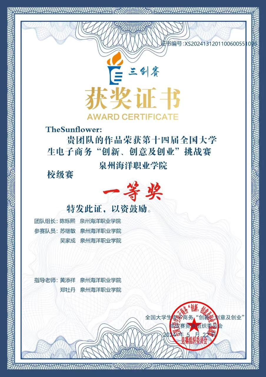 2024年3月 第十四届全国大学生电子商务“创新、创意、创业”泉海挑战赛一等奖 (校级)