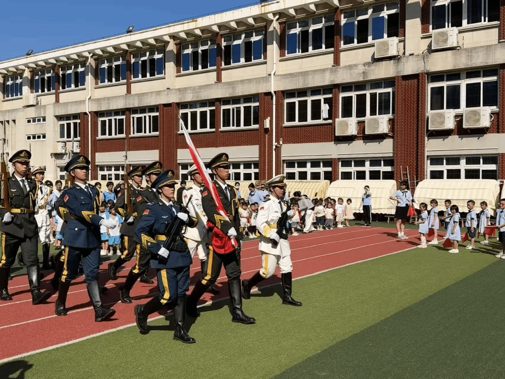 清晨,阳光洒满校园。泉州海洋职业学院国旗护卫队的队员们身着整齐的礼宾服,迈着铿锵有力的步伐,以饱满的精神状态出现在幼儿园操场上。在全体师生庄严的注视下,队员们展示了出旗、升旗的全过程。当鲜艳的五星红旗在雄壮的国歌声中冉冉升起,全体人员行注目礼,现场气氛庄严肃穆。