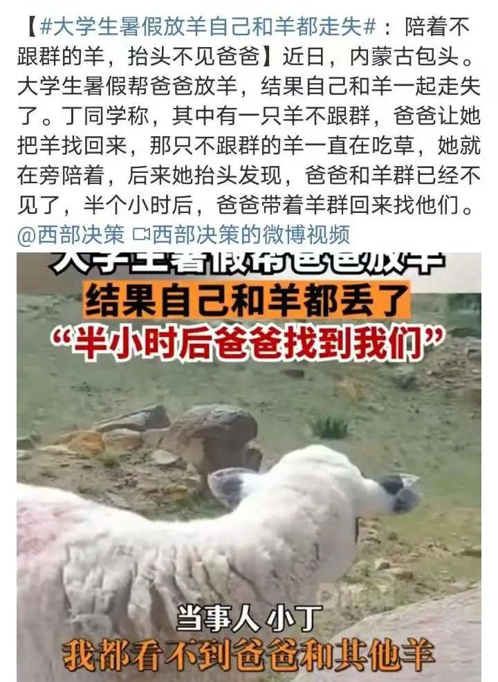 近日,一则“大学生暑假放羊自己和羊都走失”的新闻登上热搜,再一次向公众展示了当代大学生的“迷糊”形象。