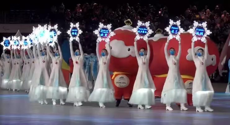 在标兵志愿者和吉祥物“雪容融”迎接下入场