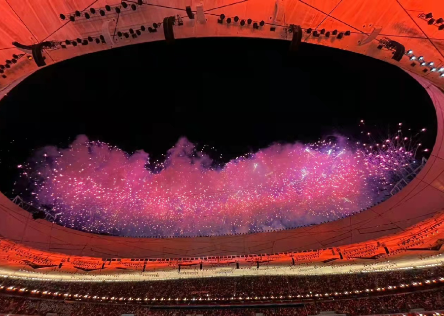 开幕焰火由特效焰火构成的紫色“雪花”,