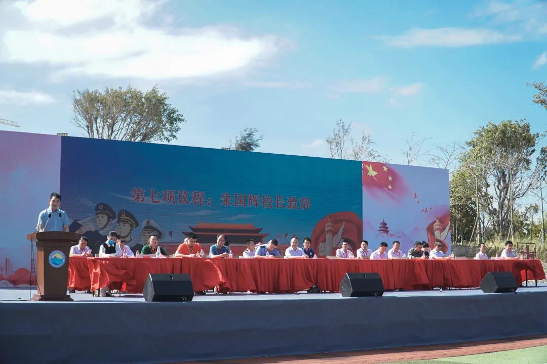 校长朱国辉向国防教育学院书记李艺鹏授旗,宣布2021级国防后备班特训营正式开训。