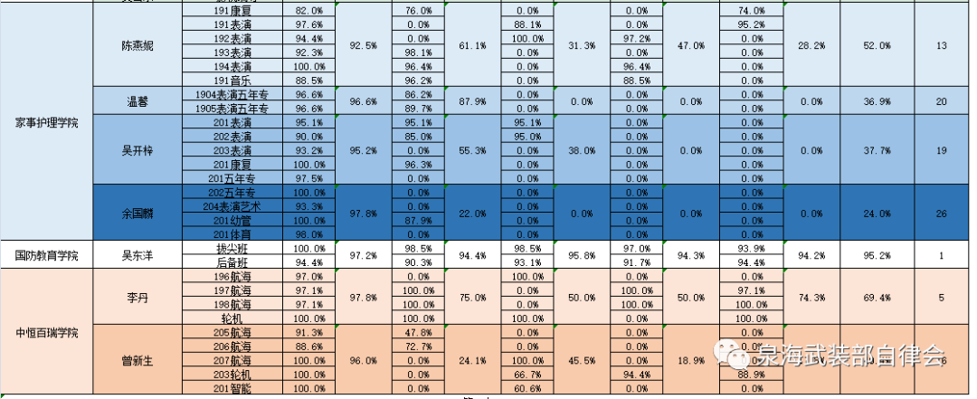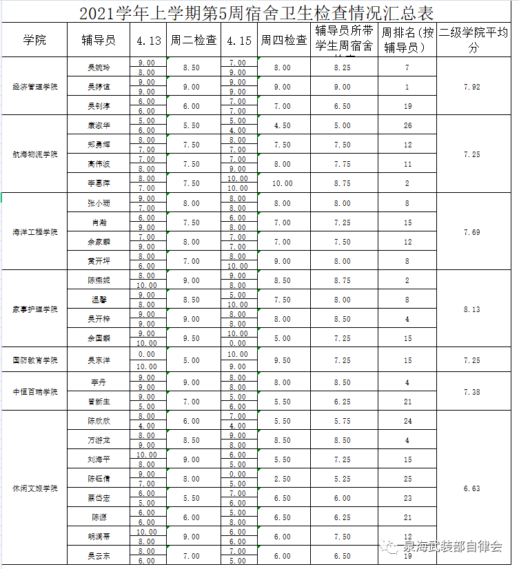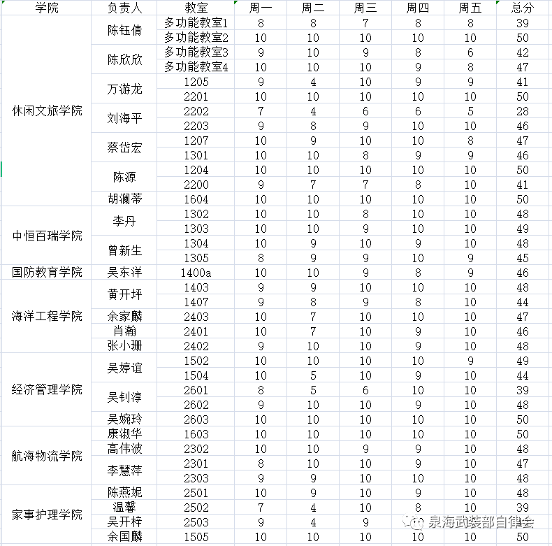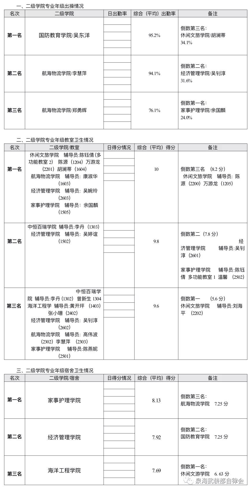 为发扬文明精神,宣扬“感恩怀天下,励志铸英才”的校训,提高同学们的自律性,营造良好的学习、生活环境,根据《泉州海洋职业学院学生手册》相关规定,大学生自律委员会例行学生早集合出勤率、教室卫生检查(检查范围包括1#、2#教学楼、行政楼4楼)、宿舍卫生检查(检查范围包括3#、8#、9#学生宿舍楼)。特将本周检查结果公示如下: