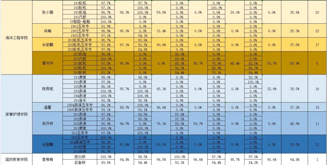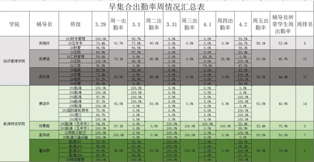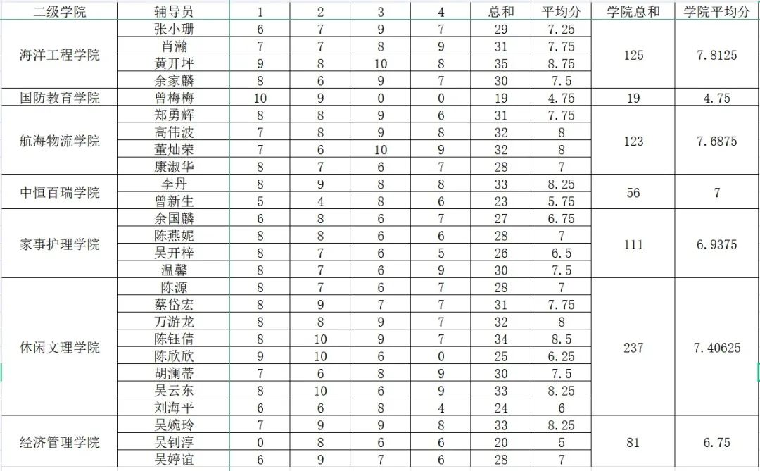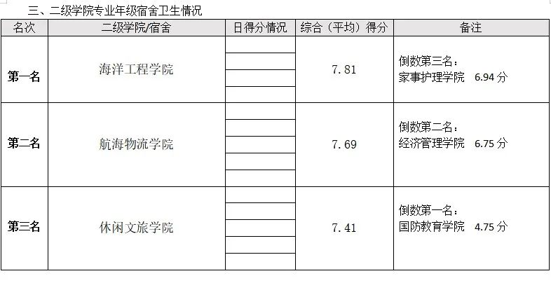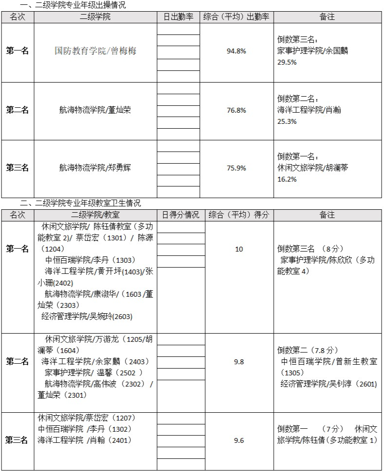 为发扬文明精神,宣扬“感恩怀天下,励志铸英才”的校训,提高同学们的自律性,营造良好的学习、生活环境,根据《泉州海洋职业学院学生手册》相关规定,大学生自律委员会例行学生早集合出勤率、教室卫生检查(检查范围包括1#、2#教学楼)、宿舍卫生检查(检查范围包括3#、8#、9#学生宿舍楼)。特将本周检查结果公示如下: