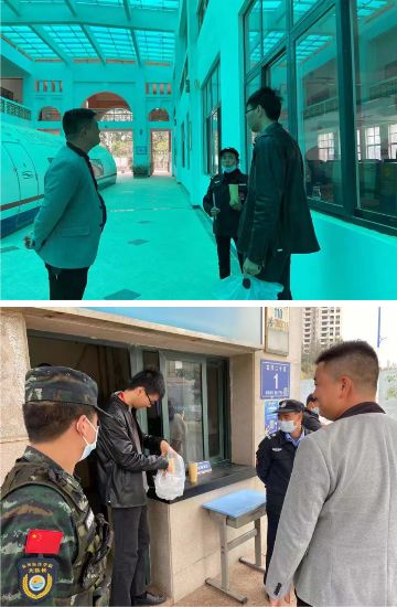 学工部苏良城部长和安保中心主任郭小军老师在教官正式上岗的第一天到各岗位看望了执勤的教官同志和保安。