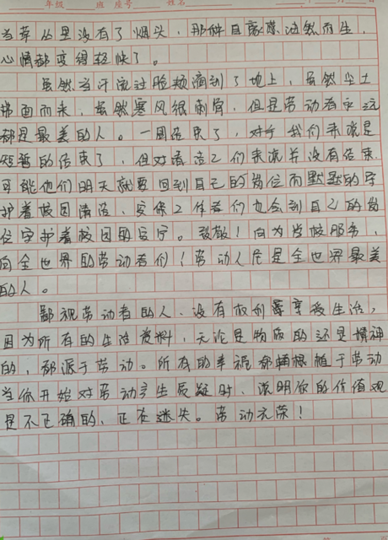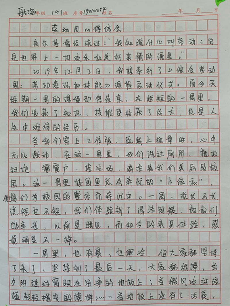 一周系统的学习,学生对劳动都有全新的认识,航海191班刘畅同学说:“在短短的一周里,我们收获了知识、技能,更收获了成长,也是人生中难得的经历。一周里也有累,也有寒冷,但大家都坚持下来,当夕阳透过窗映在洁净的地板上,当微风吹过绿植轻轻摇曳的模样,当地板上没有了污渍,当草众里没有了烟头,那种自豪感油然而生,心情都变得轻快了”。