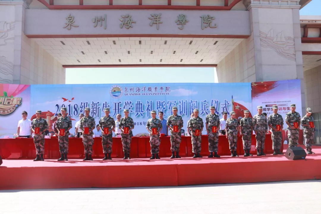 学生处处长、学院武装部部长苏良城老师宣读《泉州海洋职业学院关于表彰2018级军训优秀教官、优秀中队、优秀标兵的决定》。李煜杰等15名教官被授予“优秀教官”荣誉称号,授予航海三中队等五个中队荣获“优秀中队”荣誉称号,授予李明轩等58名同学荣获“优秀标兵”荣誉称号。