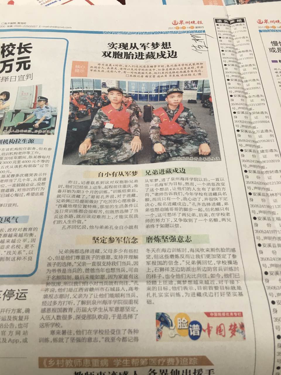 孔齐回忆说,他与弟弟孔全自小就有从军梦,进了泉州海洋学院以后,一直以当一名海军为目标,然而,一个消息改变了他们的想法,让他们的人生有了新的方向,“学校的老师告诉我们,今年学校有进藏兵名额,而且只有一个。我心动了,并很快下定决心,报名进藏戍边。”哥哥选择进藏,弟弟也想追随哥哥的脚步一起,但名额只有一个,这可愁坏了两兄弟。后来,在学校老师的努力争取下,又争取到了一个名额,两兄弟终于如愿以偿,可以一起进藏。