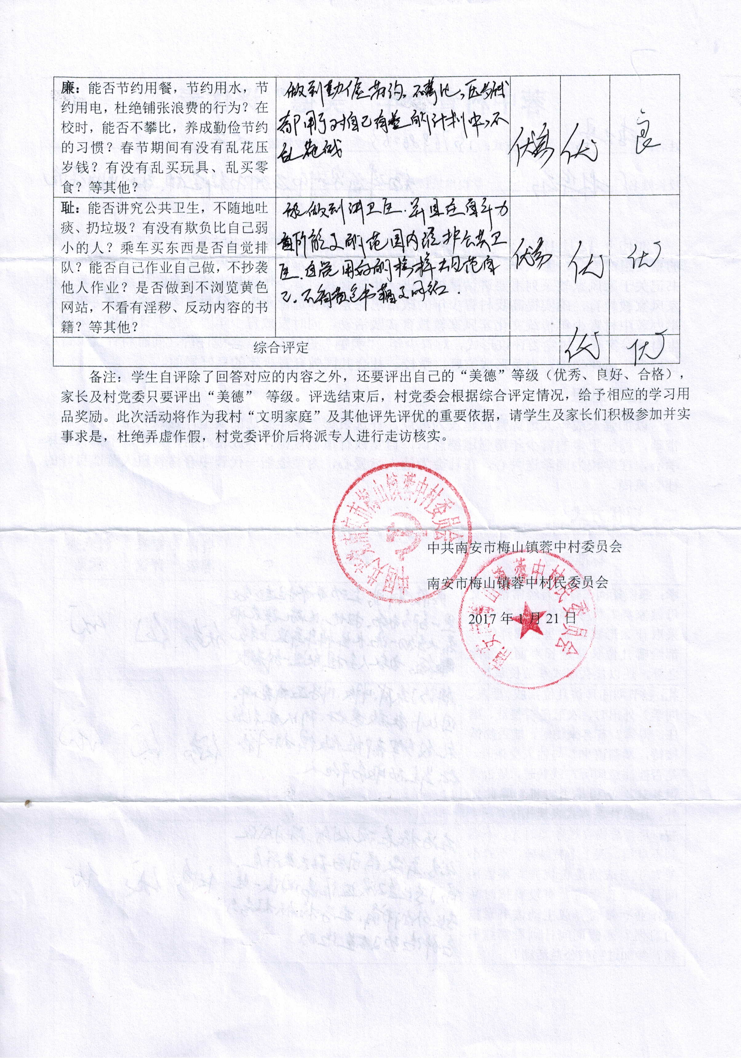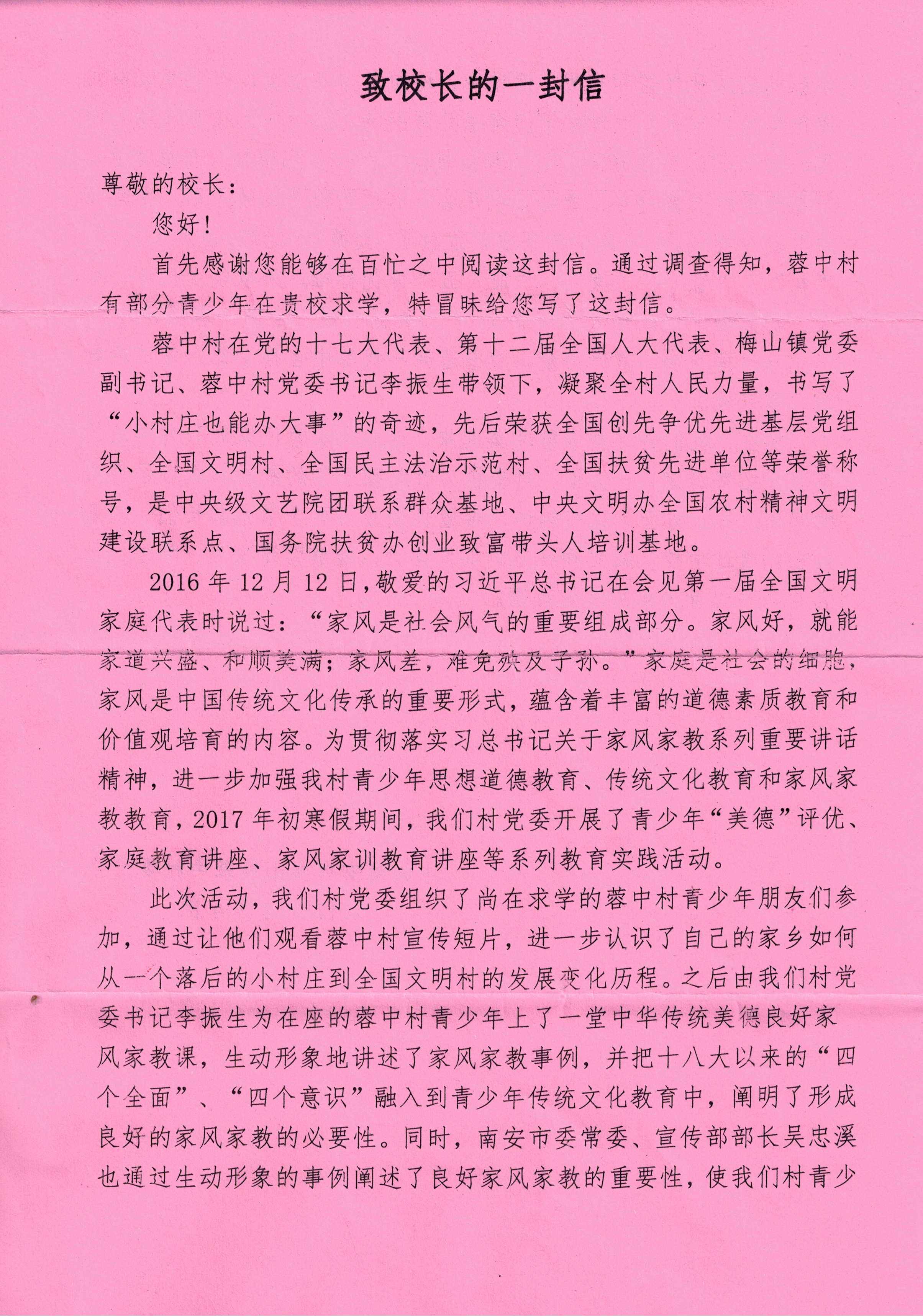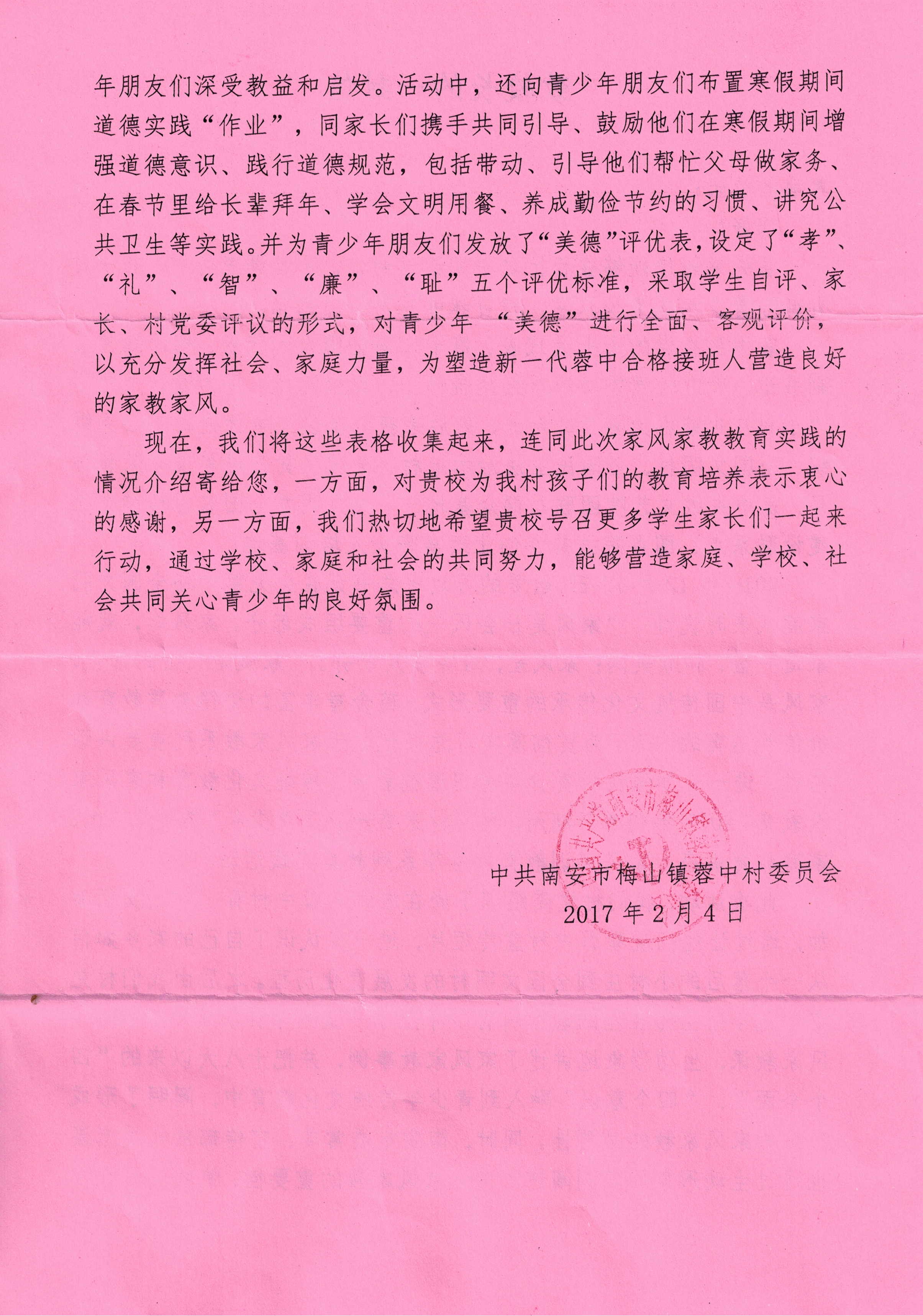 (学工处报道)2016-2017学年第二学期开学初,我院收到了一封由中共南安市梅山镇蓉中村委员会写给我院校长的一封信。信中表达了蓉中村委积极响应传承中华优秀传统文化的号召,开展的青少年“美德”评优教育实践活动,并寄来了我院李志景同学的《蓉中村青少年“美德”评优表》。