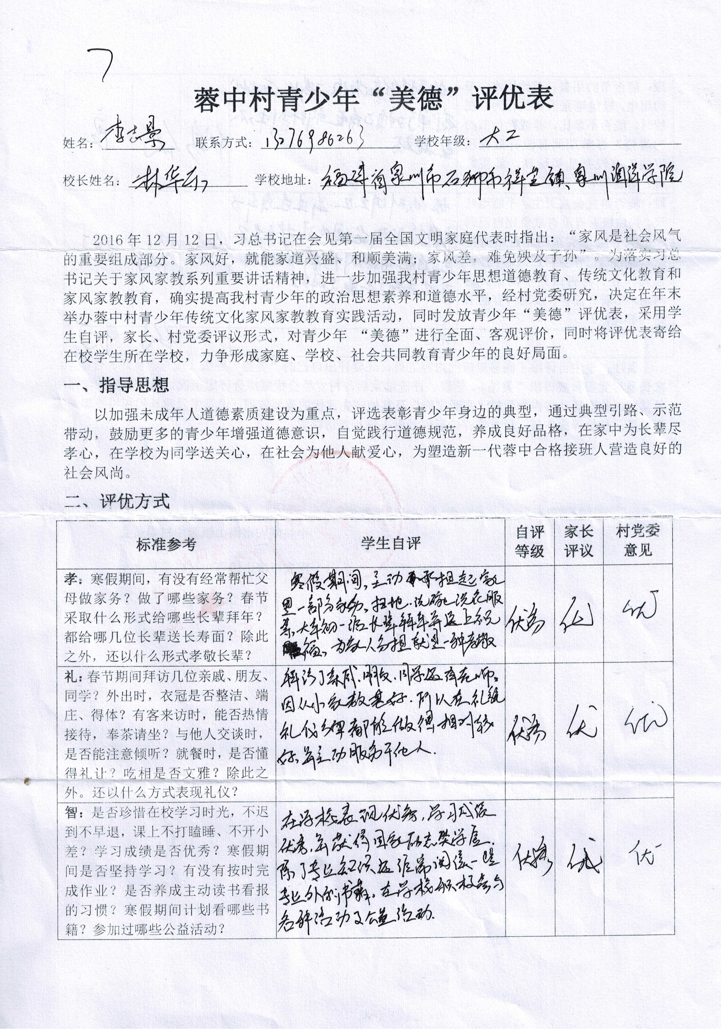 李志景,男,自2015年9月到我校报到,就读于我院艺术体育系15级151班,该生在校表现优秀,担任重要学生干部,一直潜移默化的接受着泉州海洋学院所给予的培养和教育。我院在学生教育和管理中,提倡感恩人文教育、准军事化管理和文明修身要求,在该村党委的来信中,“蓉中村青少年美德评优表”上家长与村党委为我院学子李志景同学所评议的“优”字,清晰可见,这是对泉州海洋学院在学生管理和思想教育上所做努力的最好肯定。