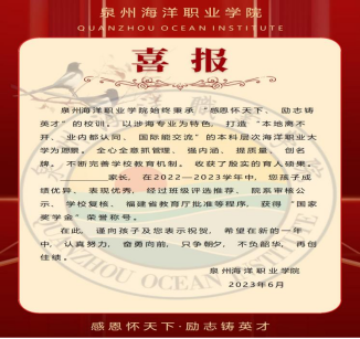 此次寄送喜报,是资助育人工作道路上的一次创新与探索,这不仅扩大了资助育人工作方面的影响力,突显了高校对资助育人工作的高度重视;也预示着泉州海洋职业学院将继续拓宽育人途径,将资助育人政策落实到学生成长成才过程中去。弦歌不辍,驰而不息。