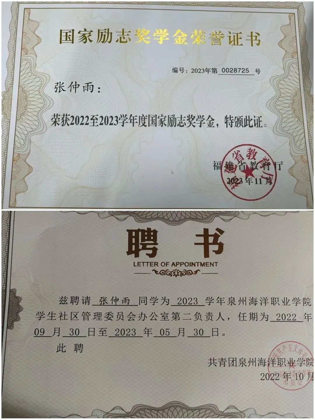 2023年11月,荣获2022至2023学年度“国家励志奖学金”;