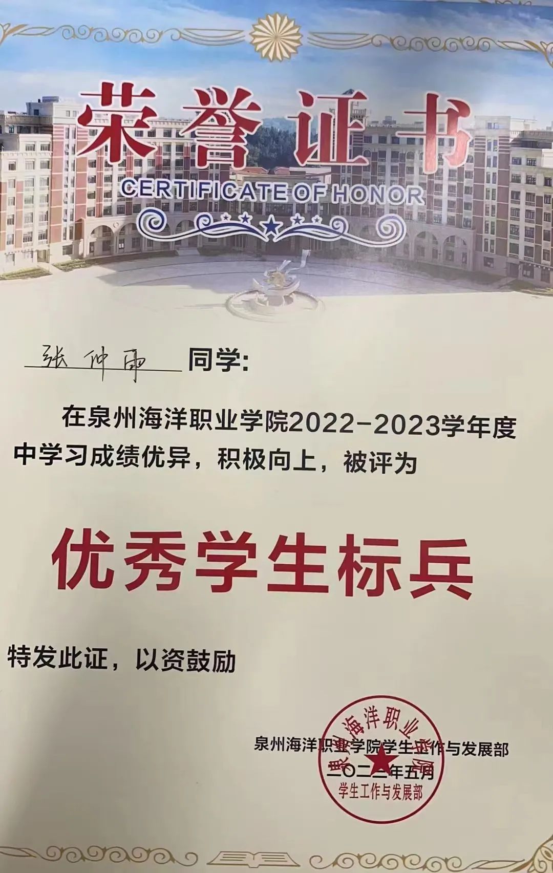 2023年5月,荣获泉州海洋职业学院 “优秀学生标兵”;