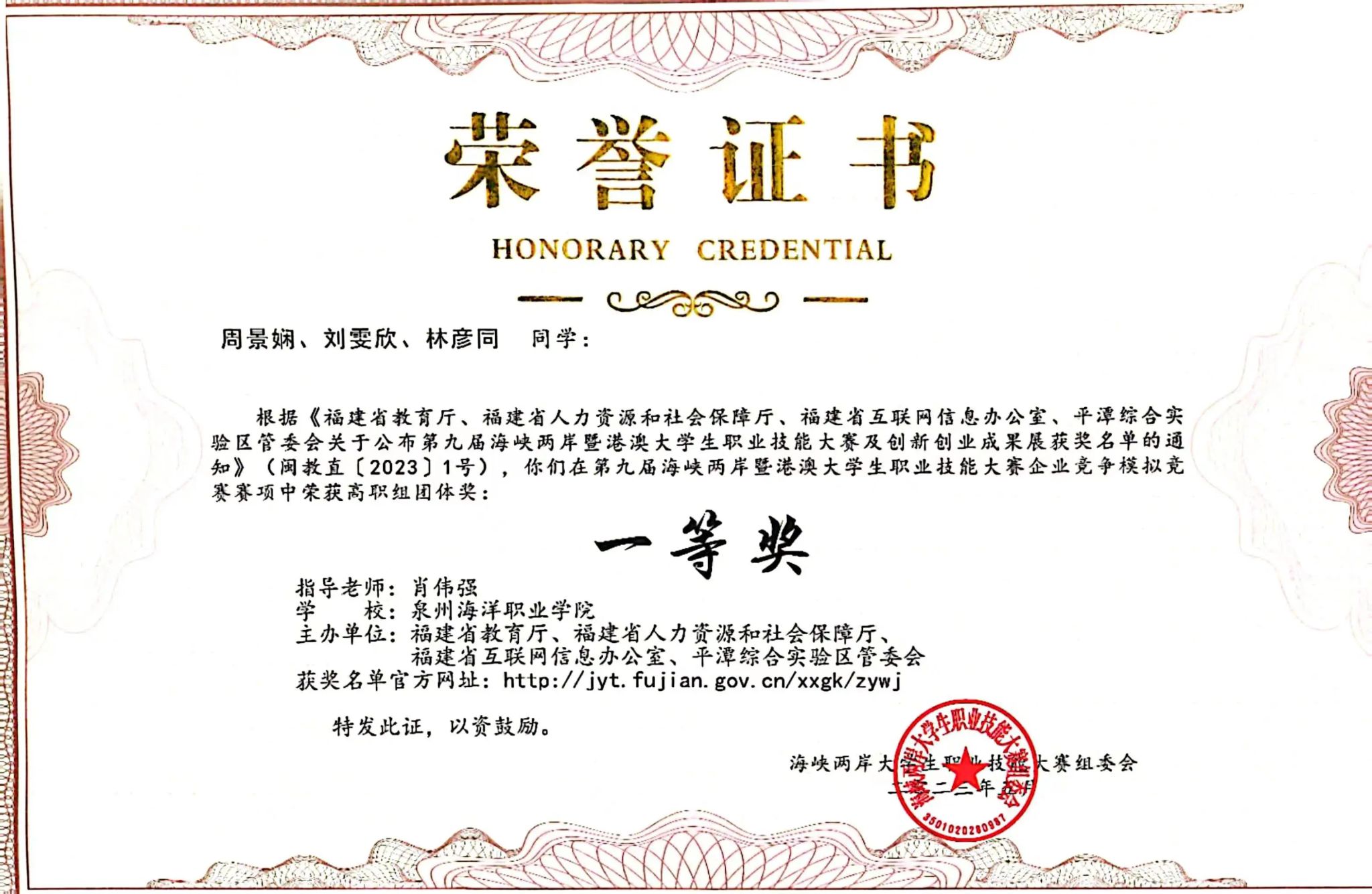 2.2022-2023学年荣获第九届海峡两岸暨港澳大学生职业技能大赛企业竞争模拟竞赛一等奖。