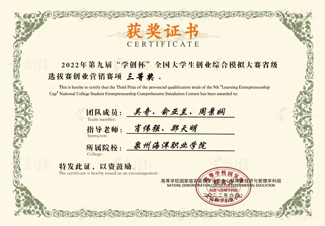 6.2022年荣获第九届"学创杯"全国大学生综合模拟大赛省级选拔赛创业营销赛项三等奖。