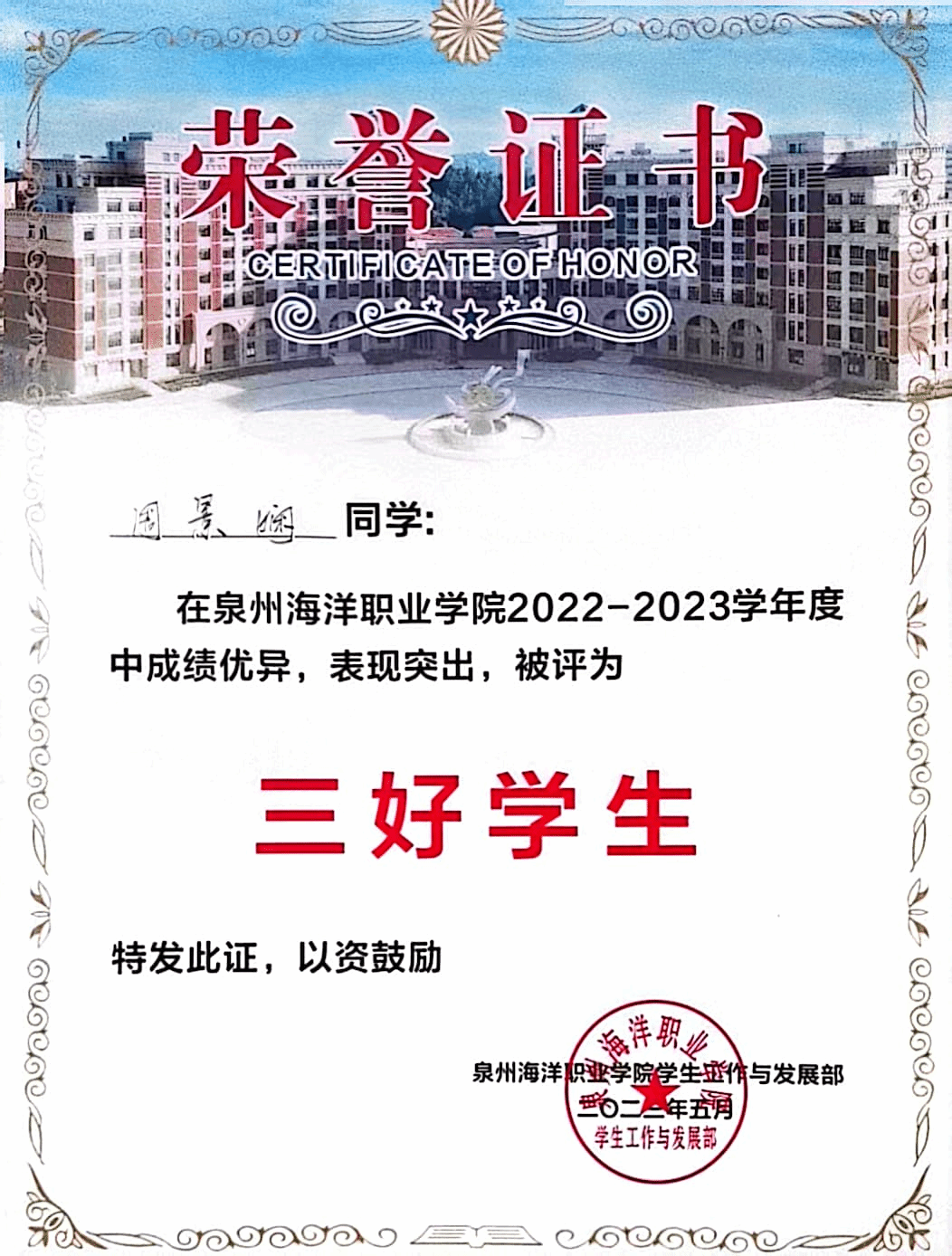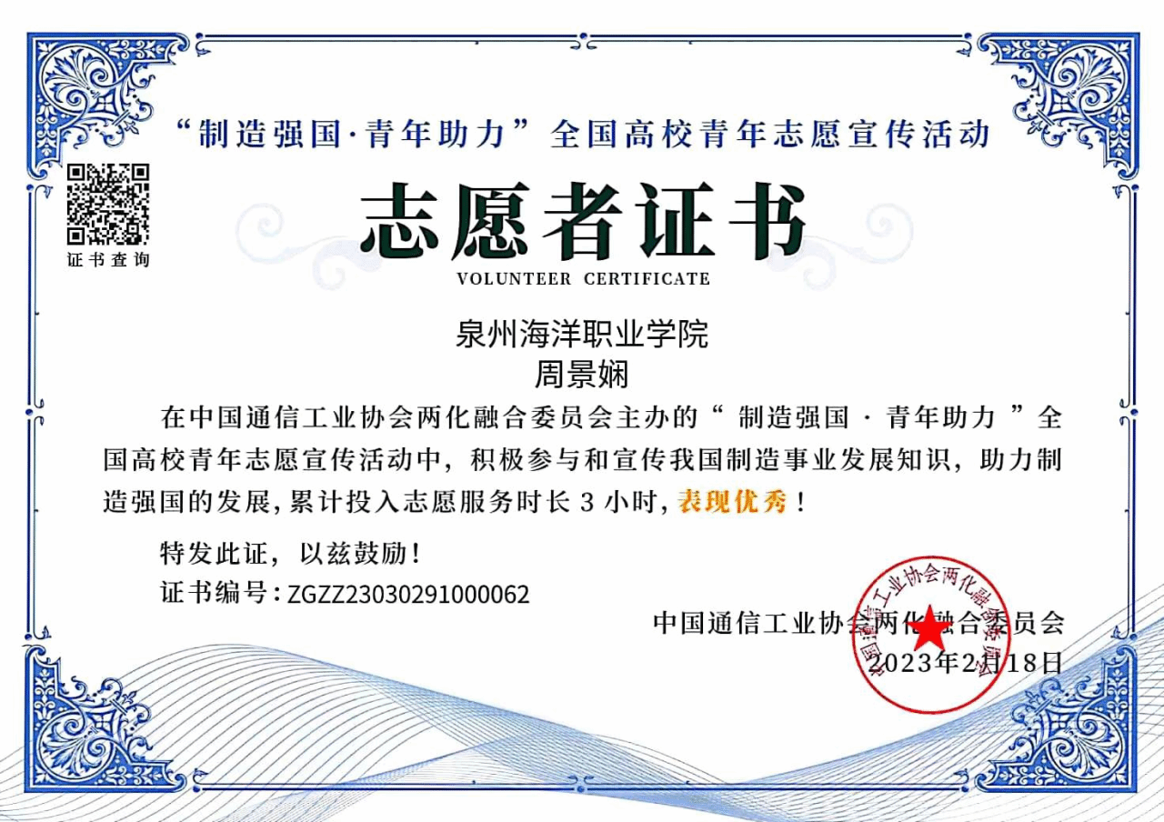 对于学习,她坚持以理论与实践相结合的方式来提升自身的专业能力,始终相信努力的意义,相信勤奋刻苦、脚踏实地,终有为之匹配的收获,好在努力过后的“彩虹”还算耀眼,在2022-2023学年她的综测排名位居第一。