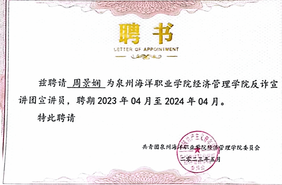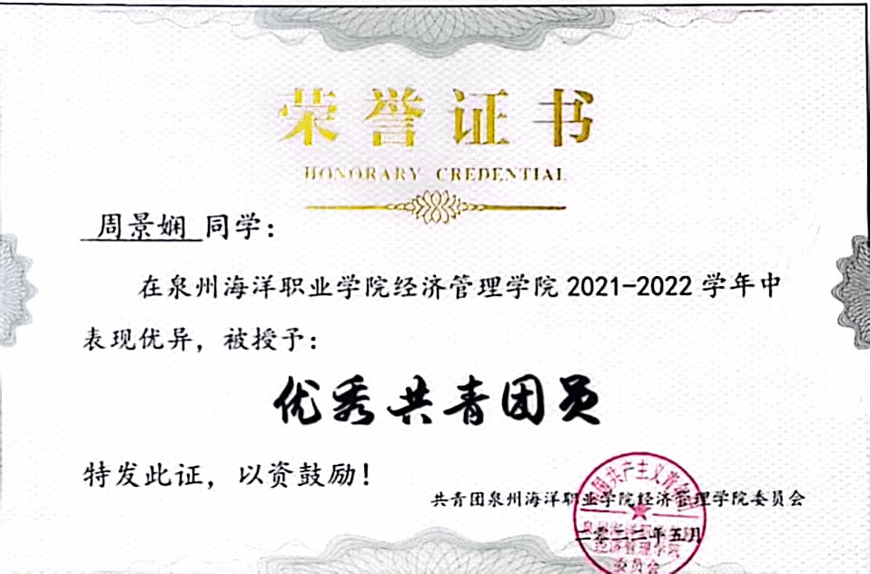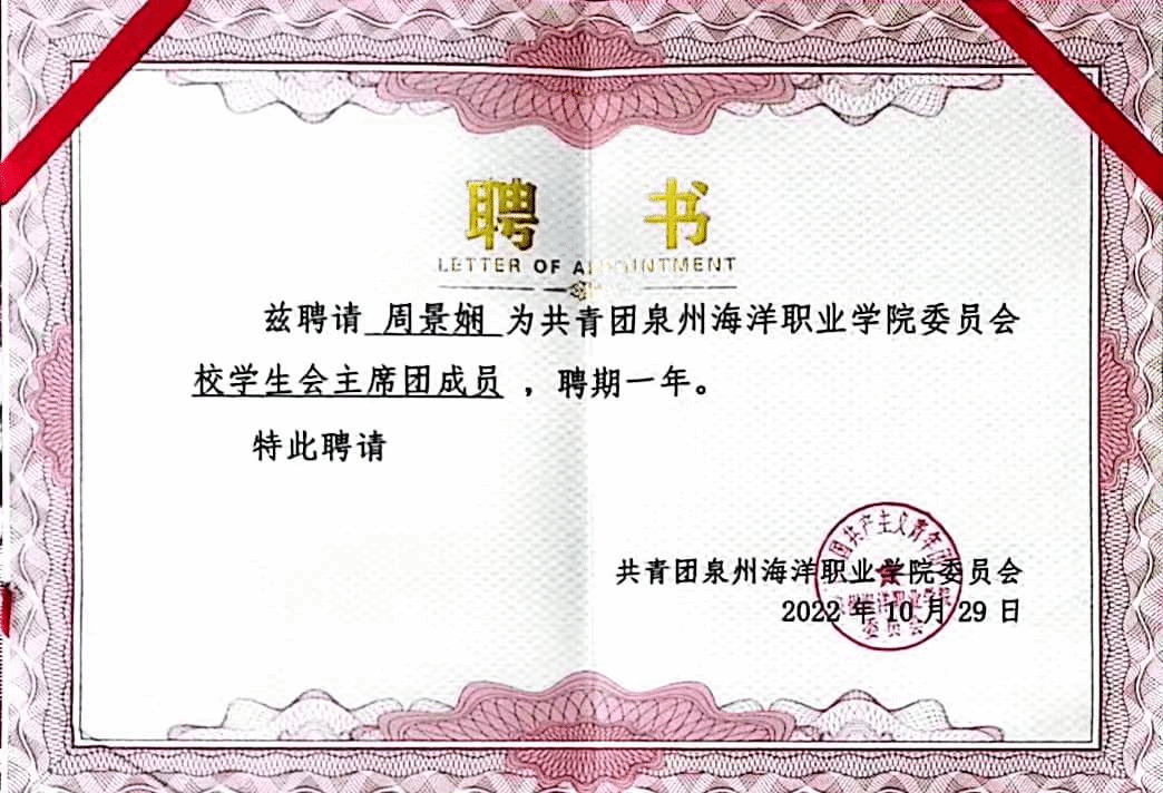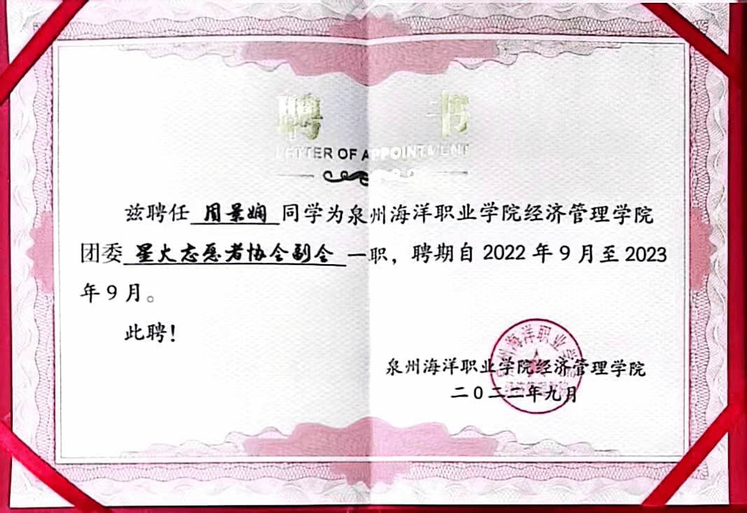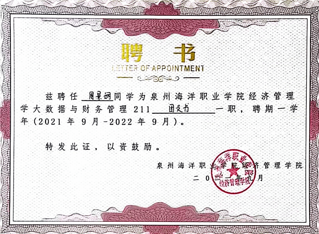 曾任校团委学生会主席团成员、经济管理学院星火志愿者协会副会长、经济管理学院反诈宣讲团成员、经济管理学院辅导员助理、大数据与财务管理211团支部团支书。