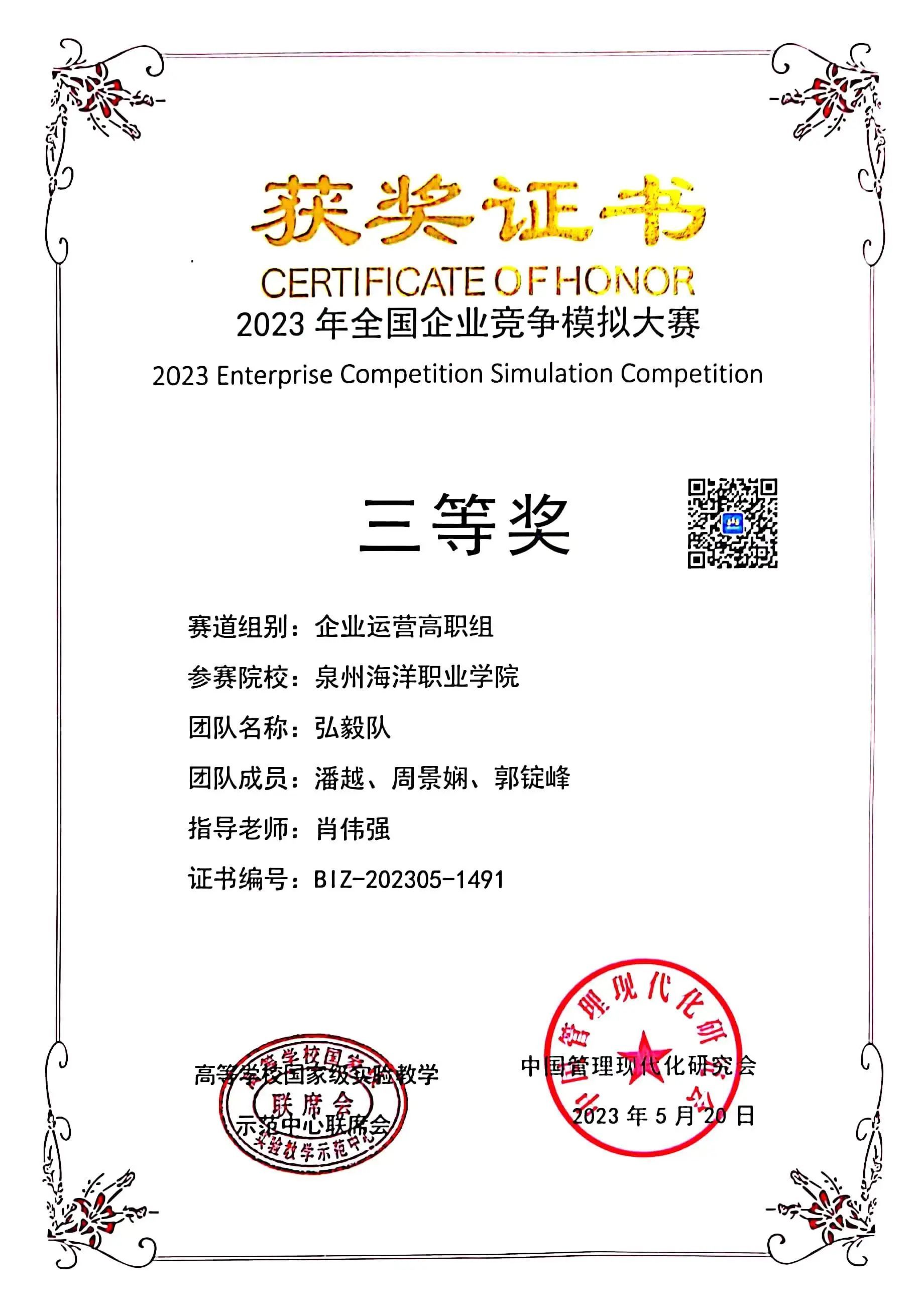 3.2022-2023学年荣获全国企业竞争模拟大赛三等奖。