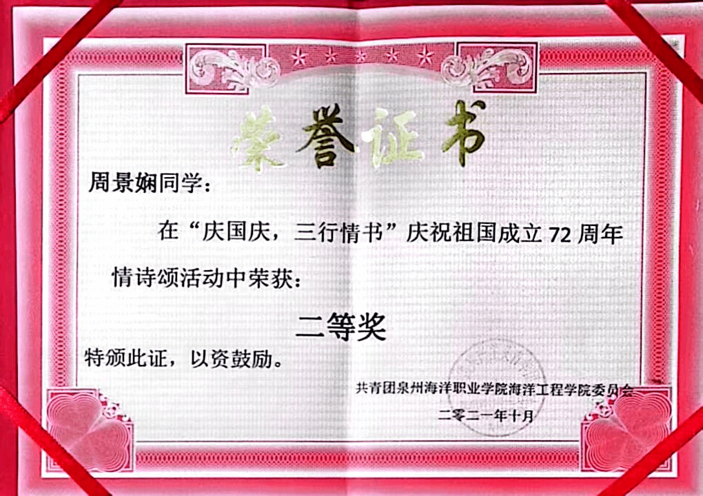 在校期间,她勤奋刻苦,潜心学习,将身边优秀的学长学姐当作学习的楷模,以他们的事迹为目标,上课时认真听讲、整理笔记,定期进行知识的整理归纳,督促自己奋发向上。