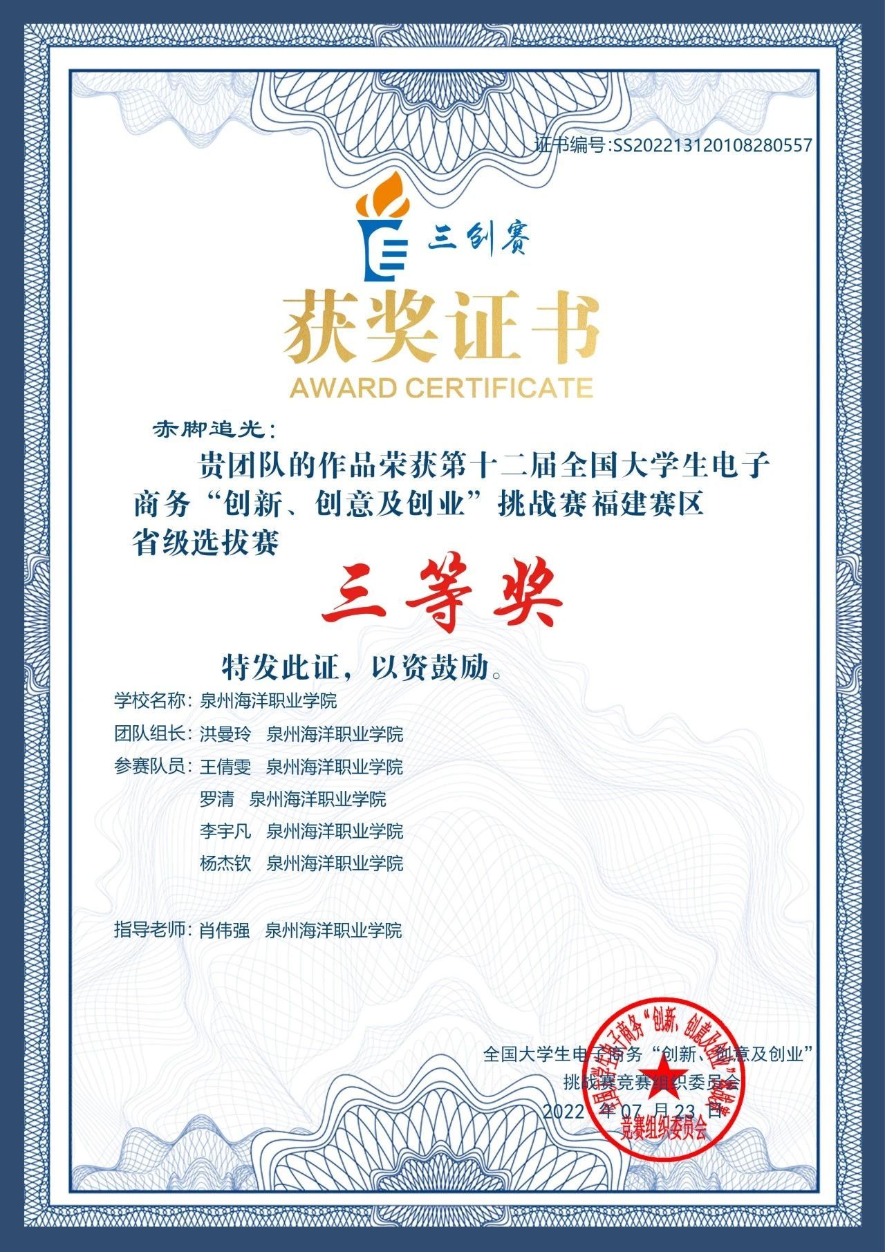 3.2023年7月荣获全国电子商务“创新,创意及创业”挑战赛竞赛组织委员会 第十二届全国大学生电子商务“创新、创意及创业”挑战赛福建赛区省级选拔赛三等奖