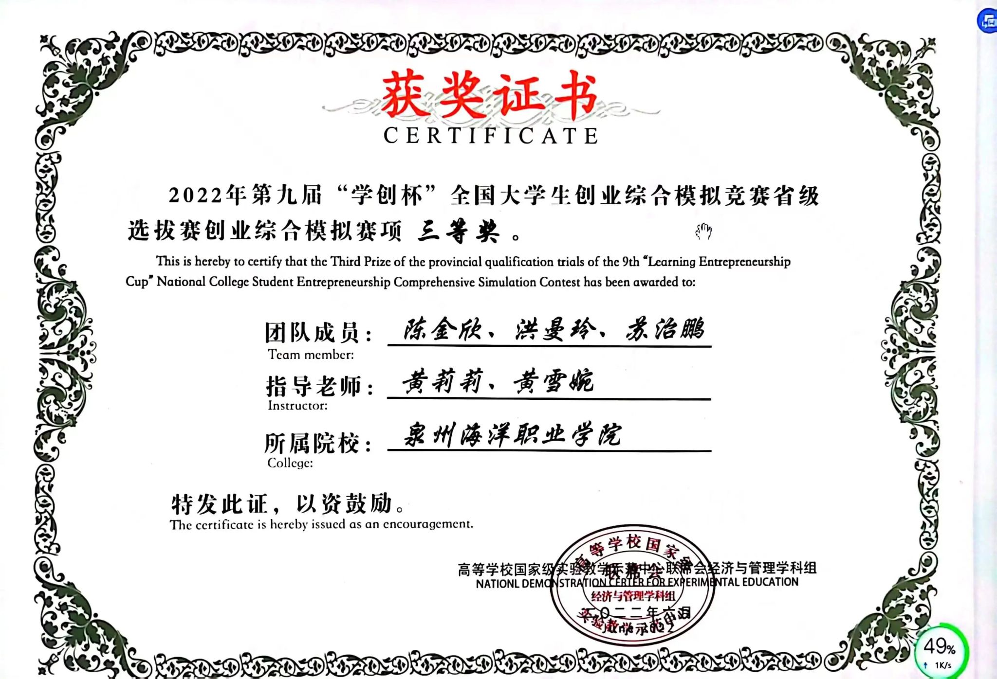5.2022年6月荣获高等学校国家级实验教学示范中心联席会经济与管理学科组 第九届“学创杯”全国大学生创业综合模拟竞赛省级选拔赛创业综合模拟赛项三等奖