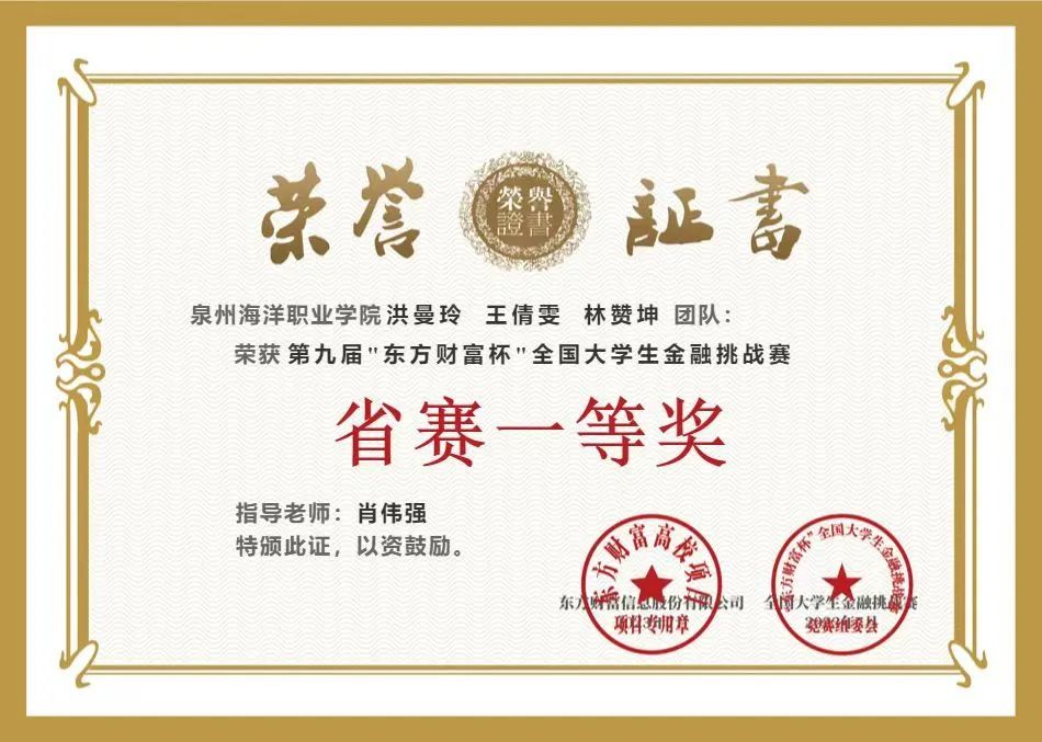 6.2023年9月荣获共青团中央青年发展部 第九届“东方财富”全国大学生金融挑战赛国赛一等奖
