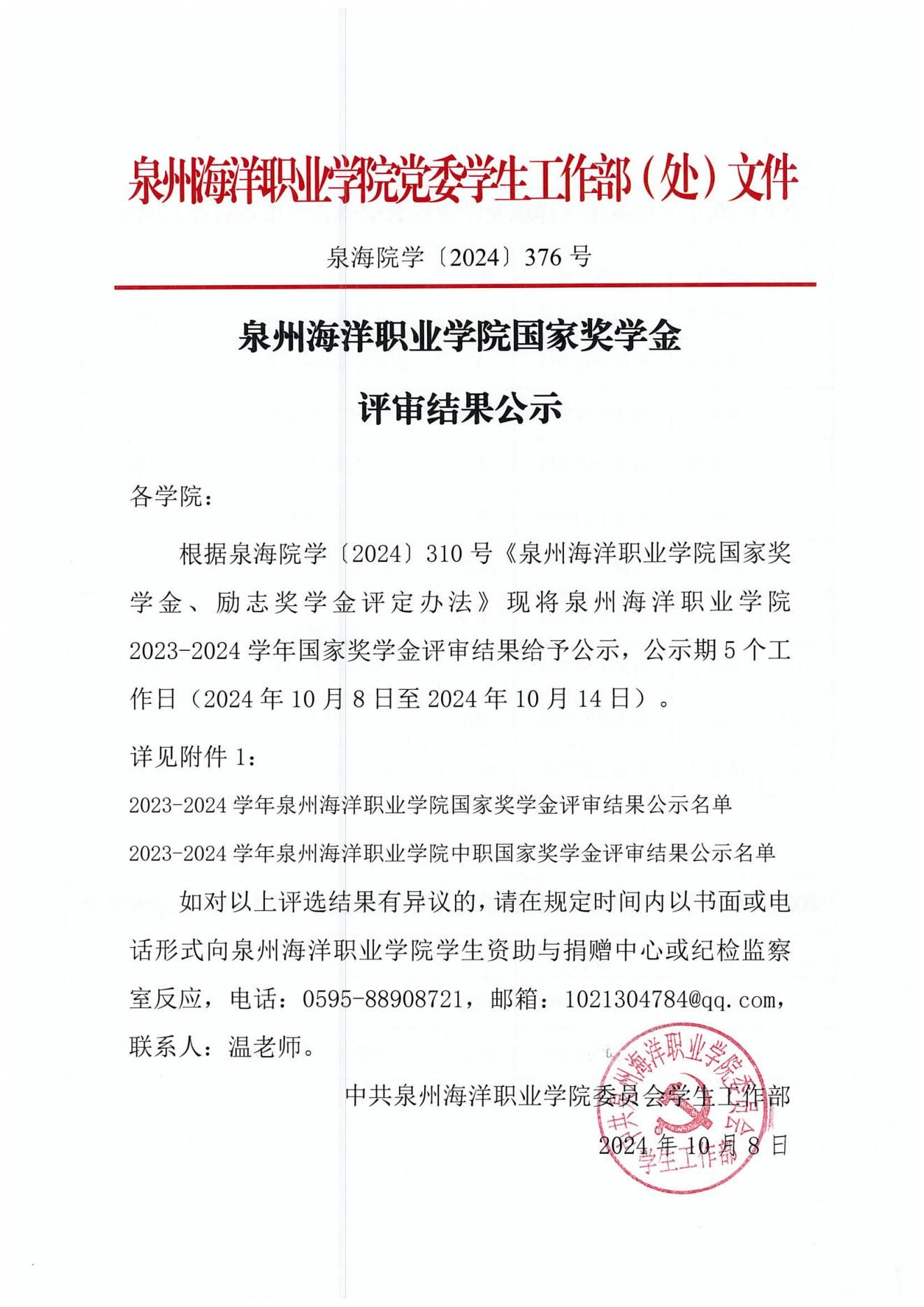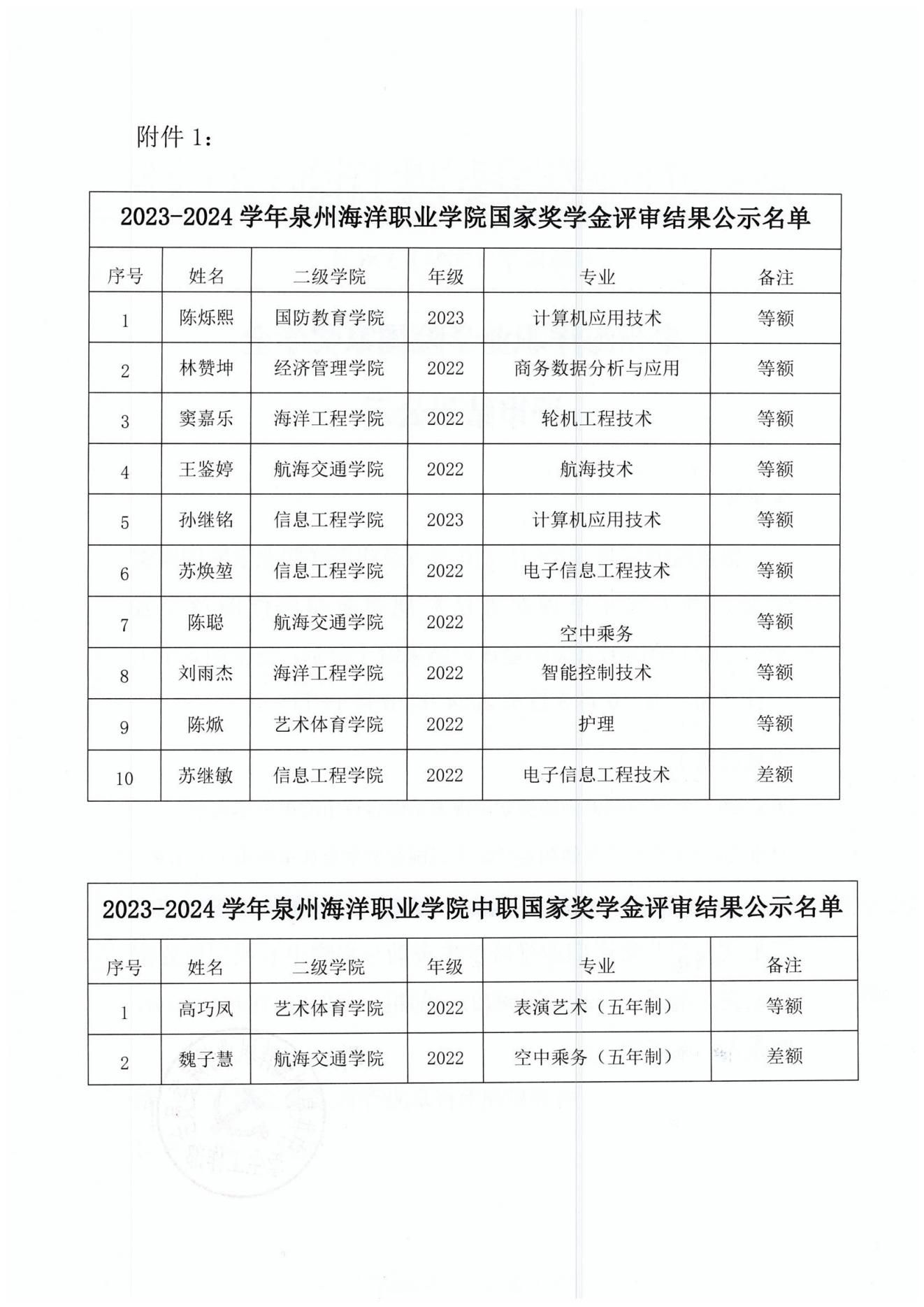 泉州海洋职业学院国家奖学金评审结果公示