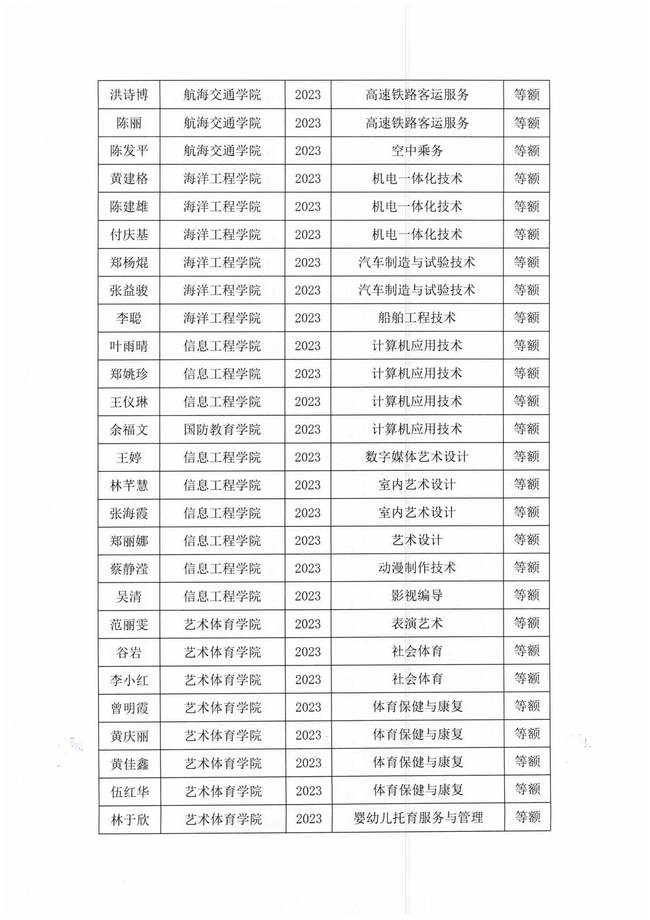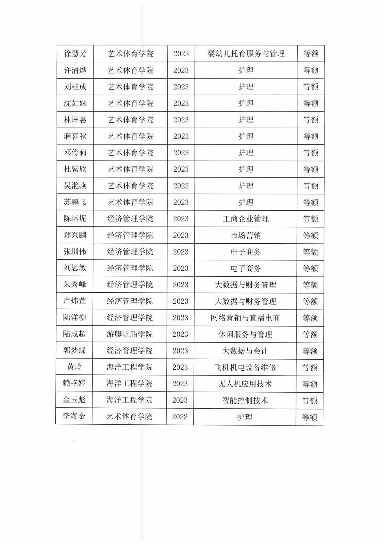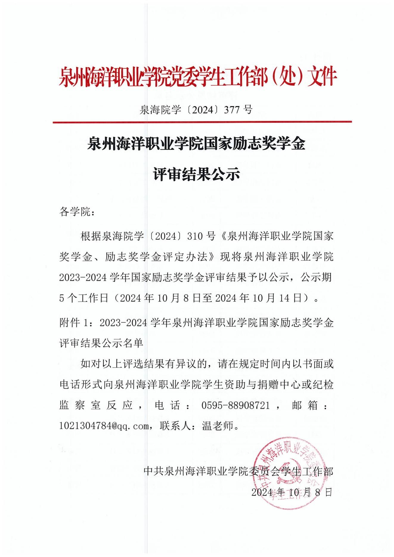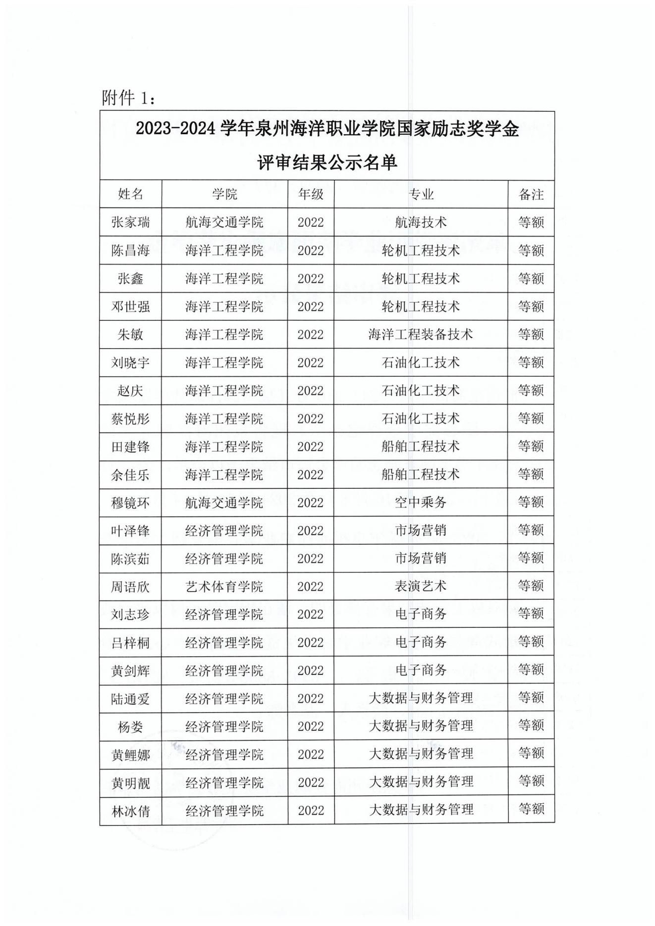 泉州海洋职业学院国家励志奖学金评审结果公示