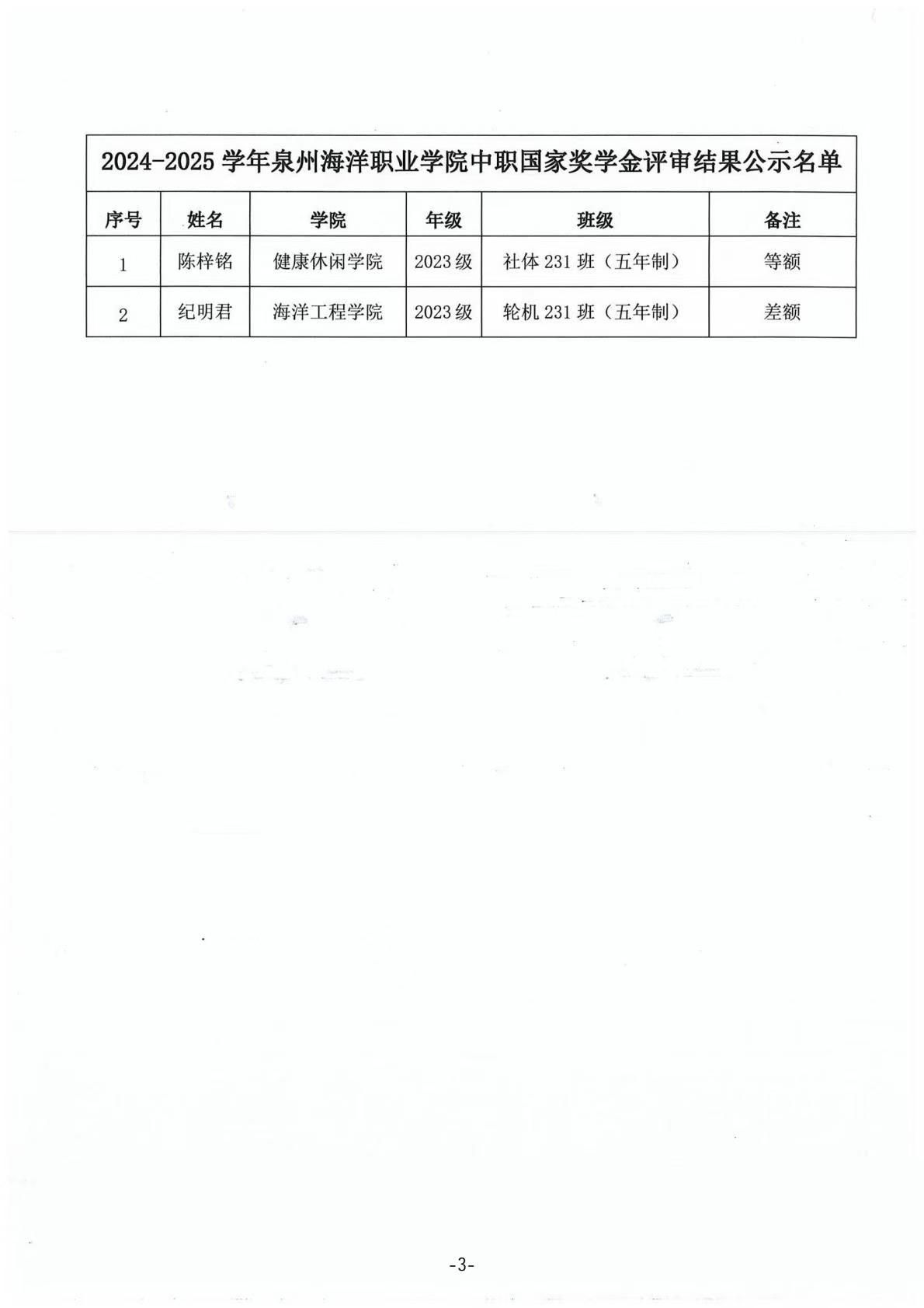 泉州海洋职业学院2024-2025学年泉州海洋职业学院国家奖学金评审结果公示
