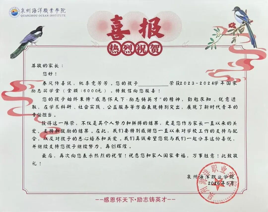 泉海荣光传家乡 从校园到家门,这份国奖喜报承载着骄傲与祝福