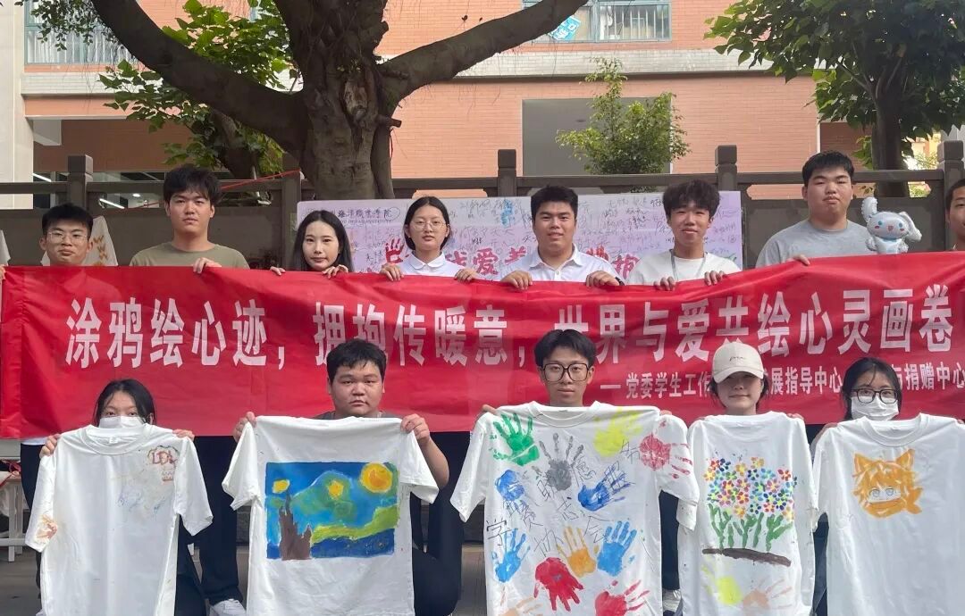 颜料与画笔在指尖流转,欢笑与拥抱在人群中蔓延。大家充分发挥天马行空的创意,将原本单调的纯白 T 恤,精心雕琢成承载情绪的艺术珍品。有人用绚丽色彩勾勒出彩虹,象征着对美好生活的向往;有人将手掌印满衣衫,寓意着自我的存在与力量;还有人把钟爱的歌词涂在衣角,让文字成为心灵的注脚。活动的魅力吸引着众多同学,即便未曾提前报名,许多路过的身影也纷纷驻足,主动加入这场心灵的狂欢。他们与工作人员一同挥洒创意,让整条校道摇身一变,成为充满艺术气息的露天画廊,处处洋溢着自由与表达的热烈氛围。