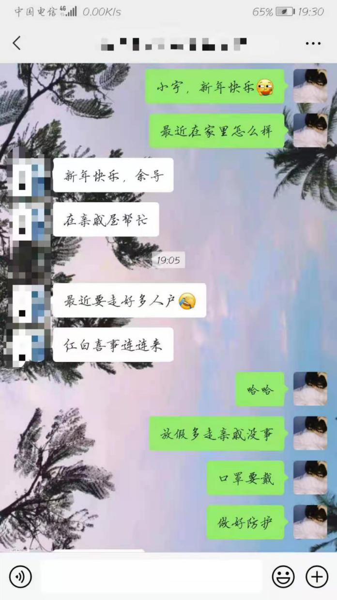 学院各级辅导员通过QQ、微信、钉钉对部分学生进行了聊天、视频线上走访。在线上走访过程中,辅导员对学生们表示了关怀,并一一解答了学生们关于本次活动的相关问题,做到了有耐心、有责任心。辅导员们通过线上视频的活动形式,向全体贫困生发出新年祝福与对学生们可以茁壮成长的期盼,并嘱咐关于疫情防控的相关事宜。鼓励学生以勤工俭学的方式创造更好的未来,提升自我能力与减轻经济负担,同时也鼓励学生遇到困难向辅导员求助,向学校求助,给同学们带来了新年里别样的温暖。