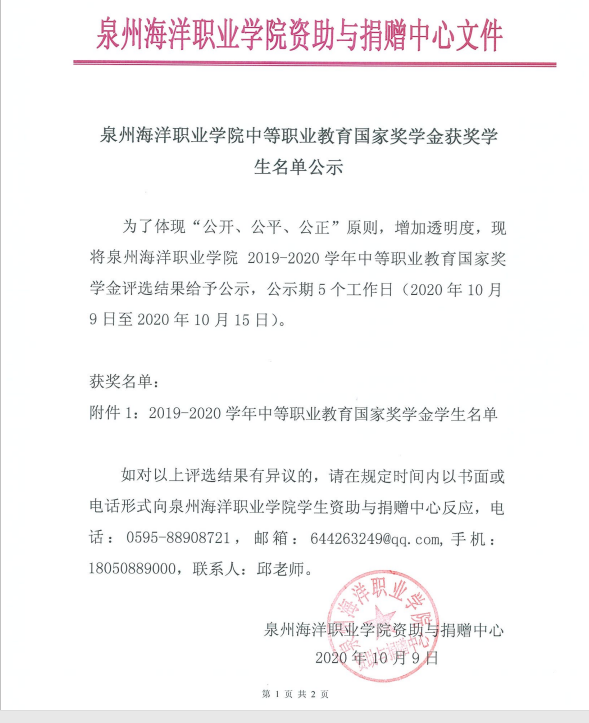 泉州海洋职业学院中等职业教育国家奖学金获奖学生名单公示