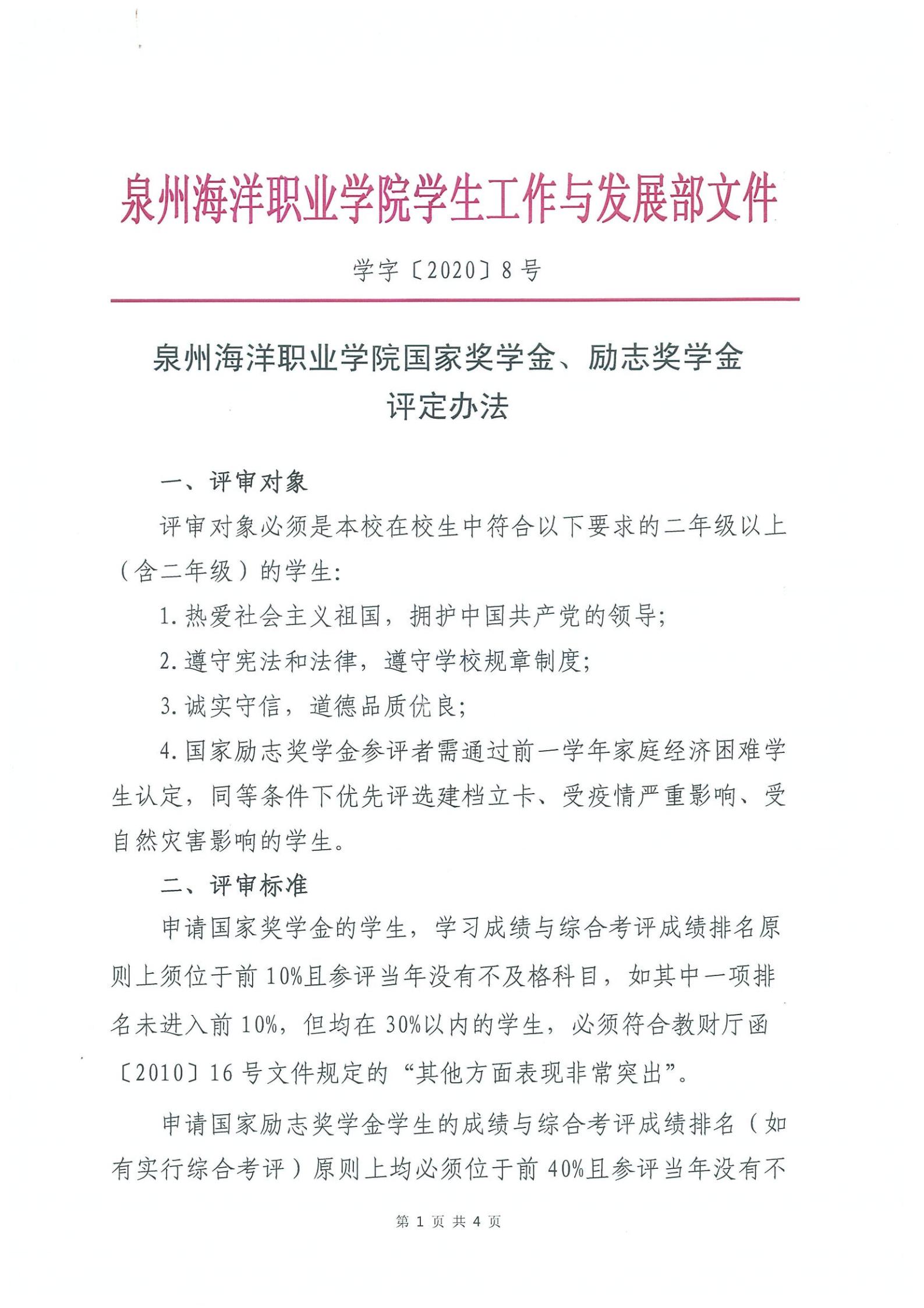 关于泉州海洋职业学院国家奖学金、国家励志奖学金评定办法
