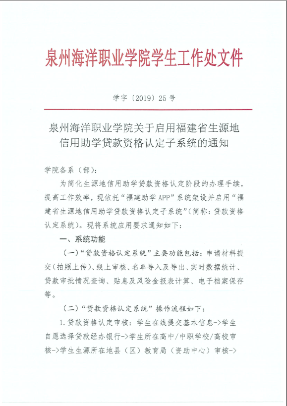 泉州海洋职业学院关于启用福建省生源地信用助学贷款资格认定子系统的通知