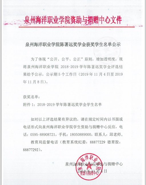 泉州海洋职业学院关于2018-2019学年陈著远奖学金名单公示