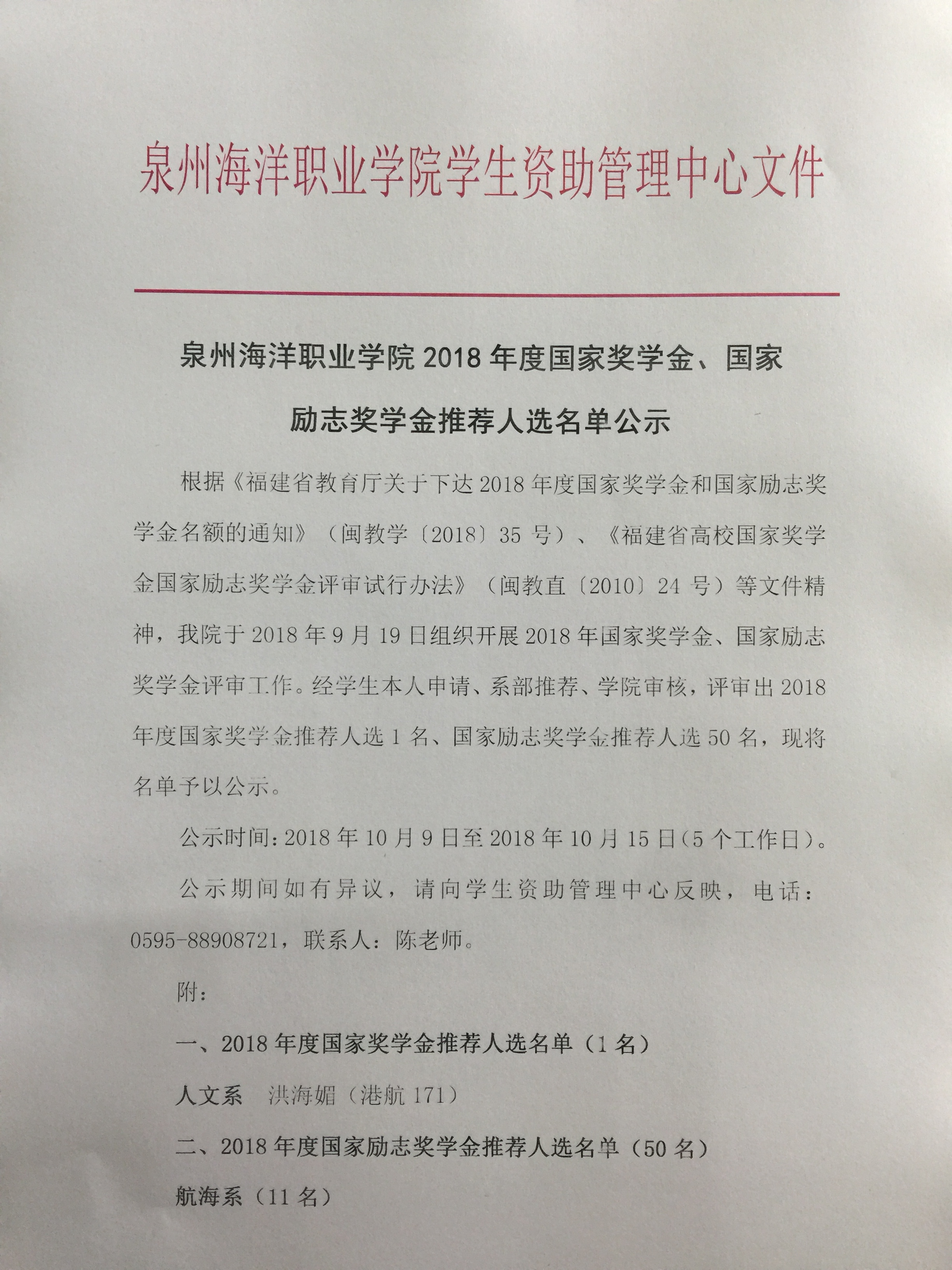 泉州海洋职业学院2018年度国家奖学金、国家励志奖学金推荐人选名单公示