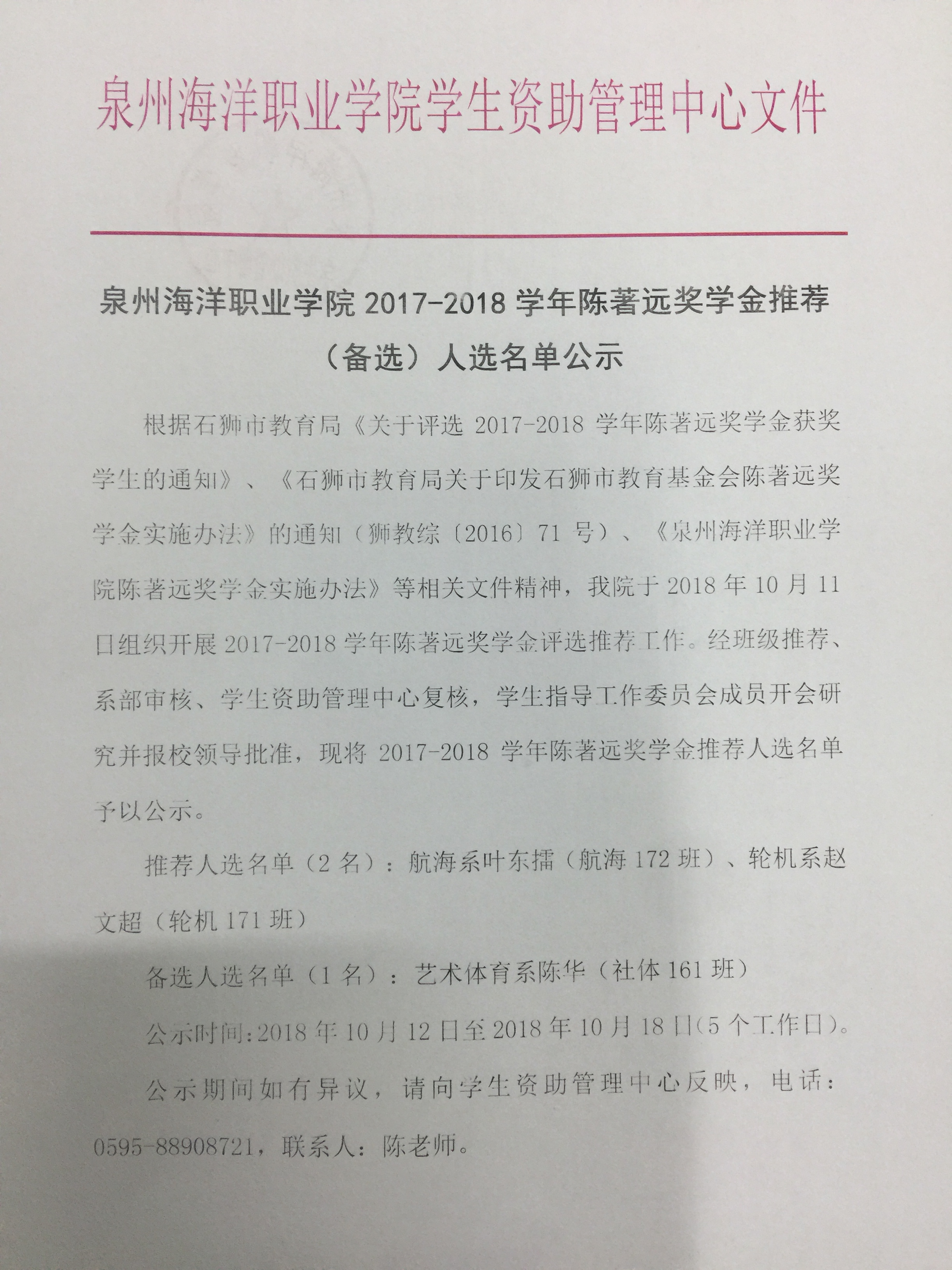 泉州海洋职业学院2017-2018学年陈著远奖学金推荐(备选)人选名单公示
