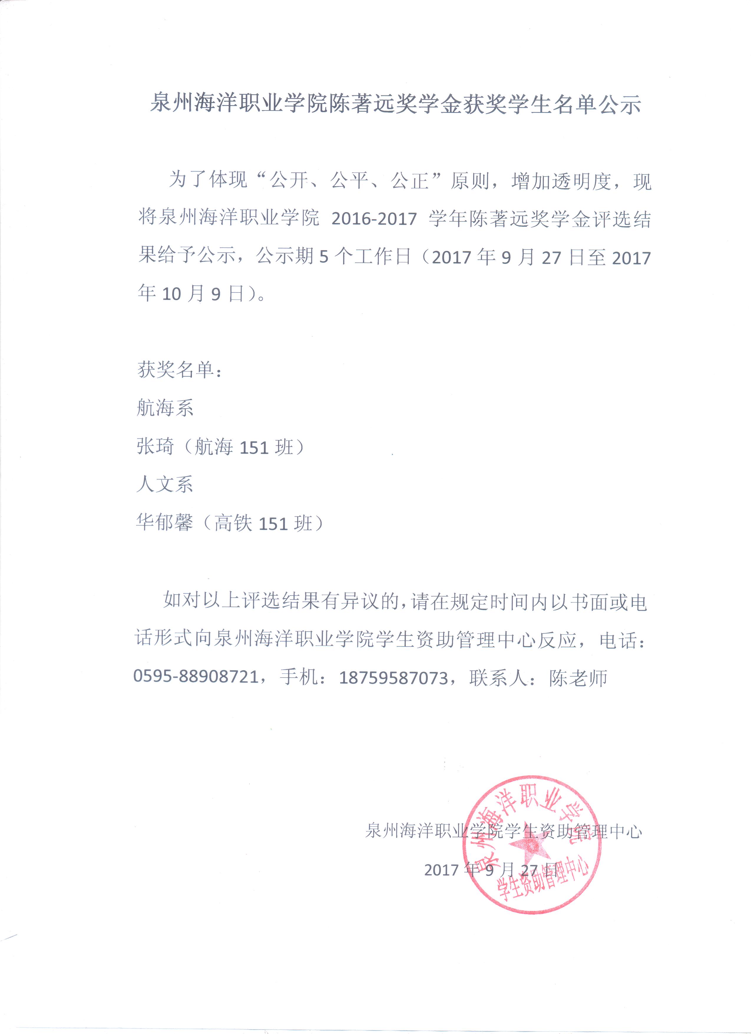 泉州海洋职业学院2016-2017学年陈著远奖学金获奖学生名单公示