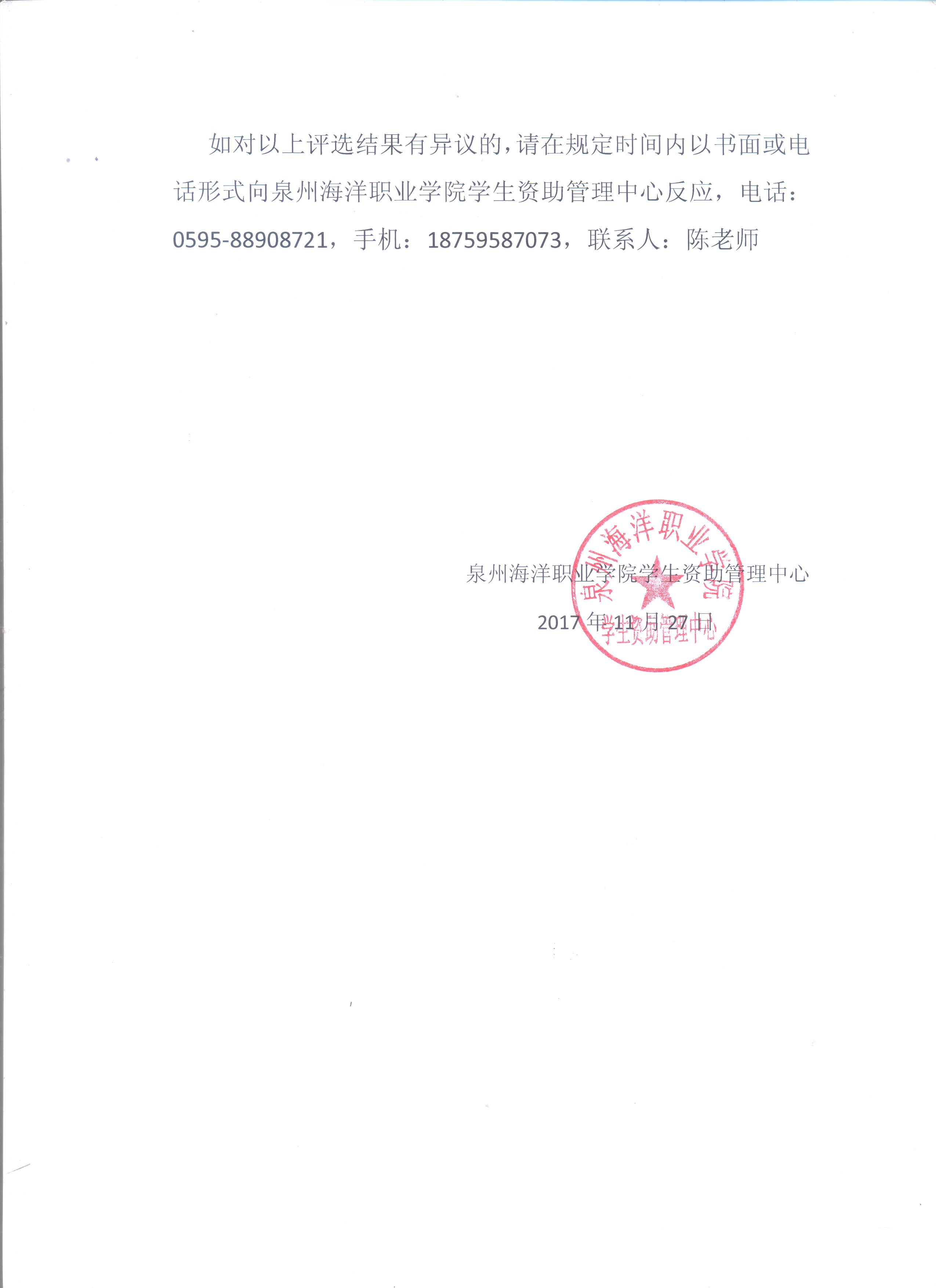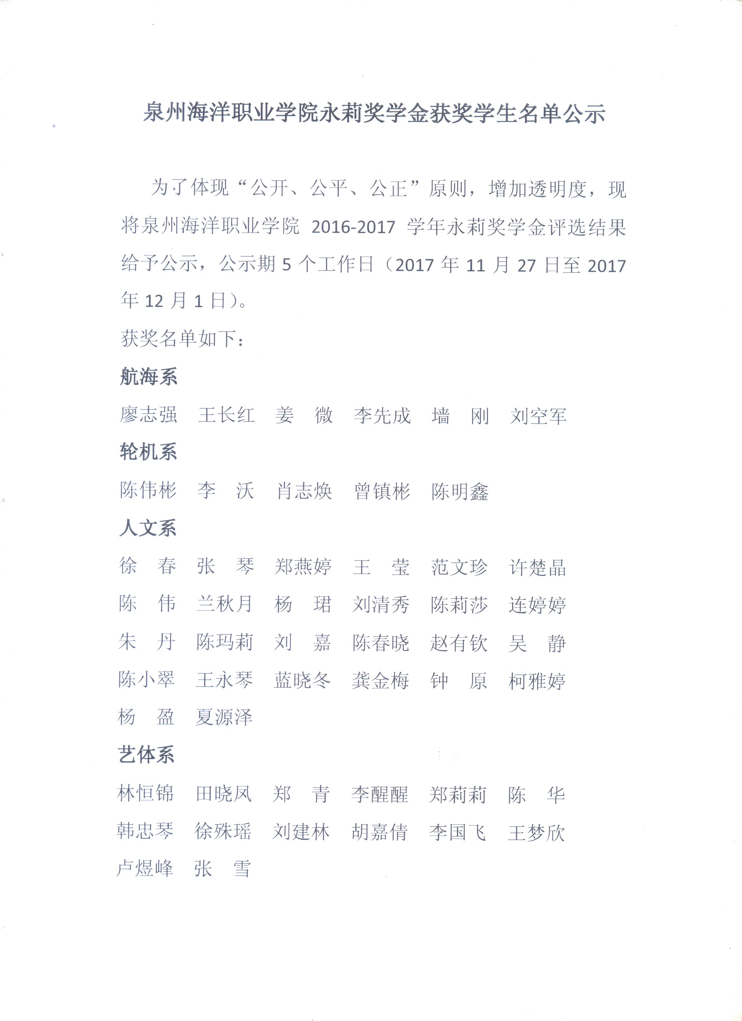 泉州海洋职业学院2016-2017学年永莉奖学金获奖学生名单公示