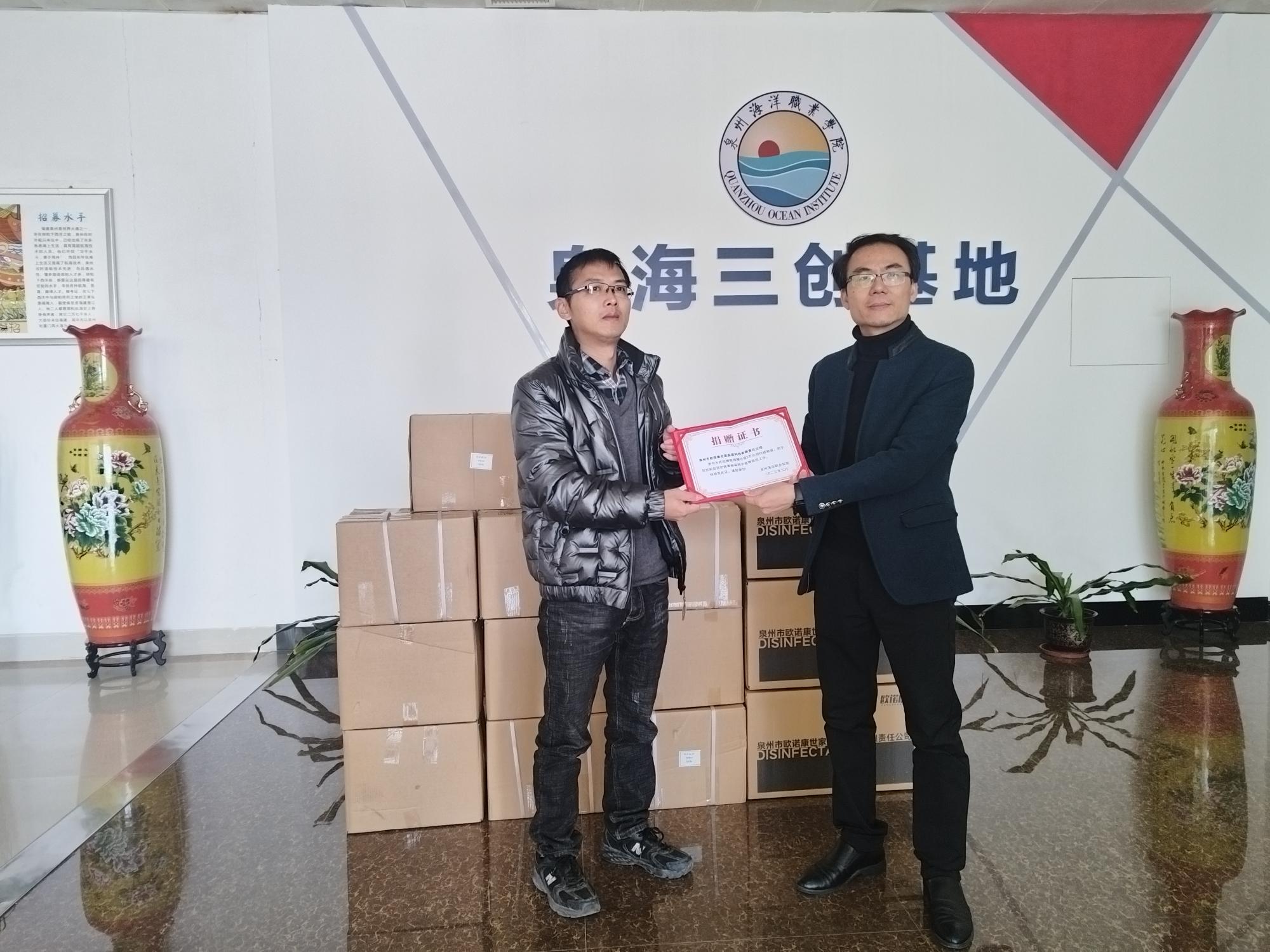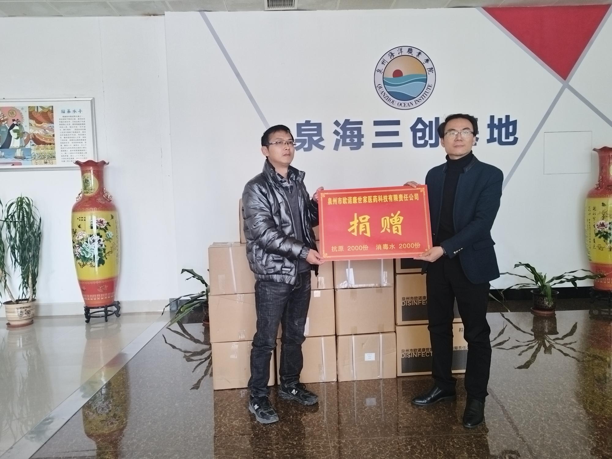 寒假已结束,新学期学生已陆续返校,我校新型冠状病毒感染防控工作也在紧张地开展。抗疫无情,人间有爱,守望相助,风雨共担。2023年2月16日上午10:00,泉州市欧诺康世家医药科技有限责任公司执行董事郑育景先生向我校捐赠了2000份抗原和2000份消毒水的抗击疫情用品,我校李明灿副校长、学生工作与发展部张君部长、对外合作部余嘉福老师在泉海三创学院出席代表学校接收这批捐赠物品。