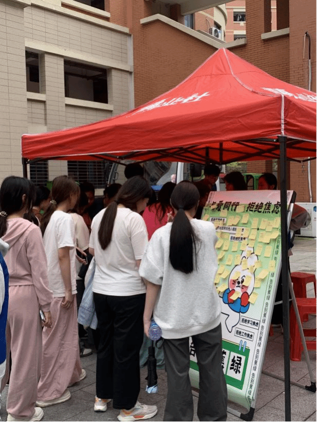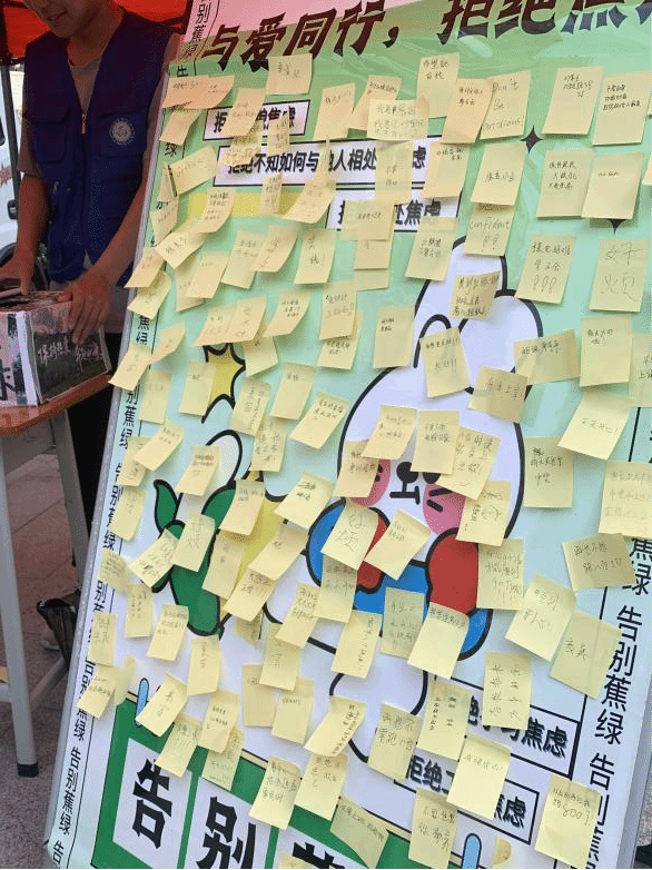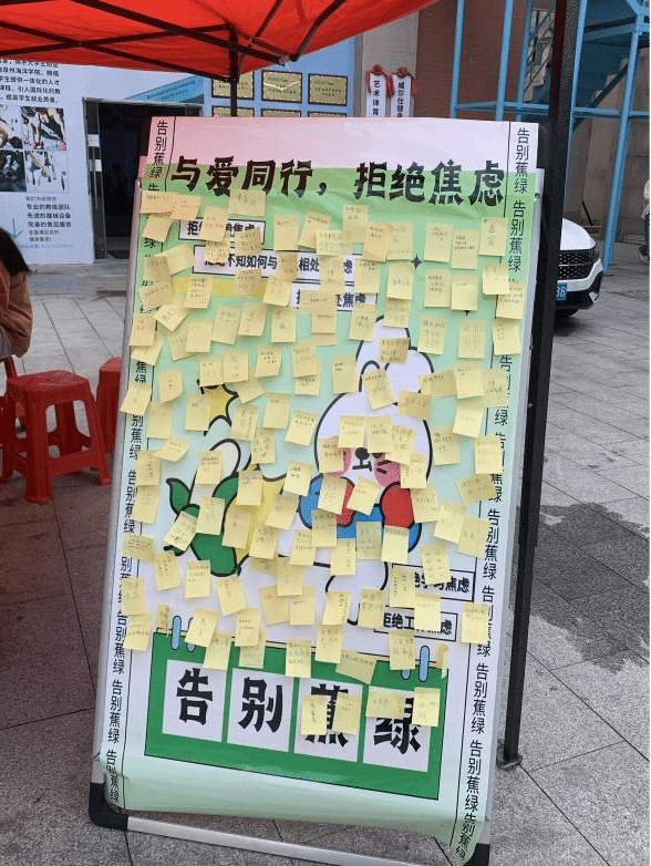 同学们在便签上匿名写下自己的焦虑或者烦恼,然后将便签贴在心理展板上,从心理展板旁的安慰盲盒中随机抽取一张便签,写下一张鼓励便签投递到安慰盲盒中进行循环,凡参与者都可获得小礼品。