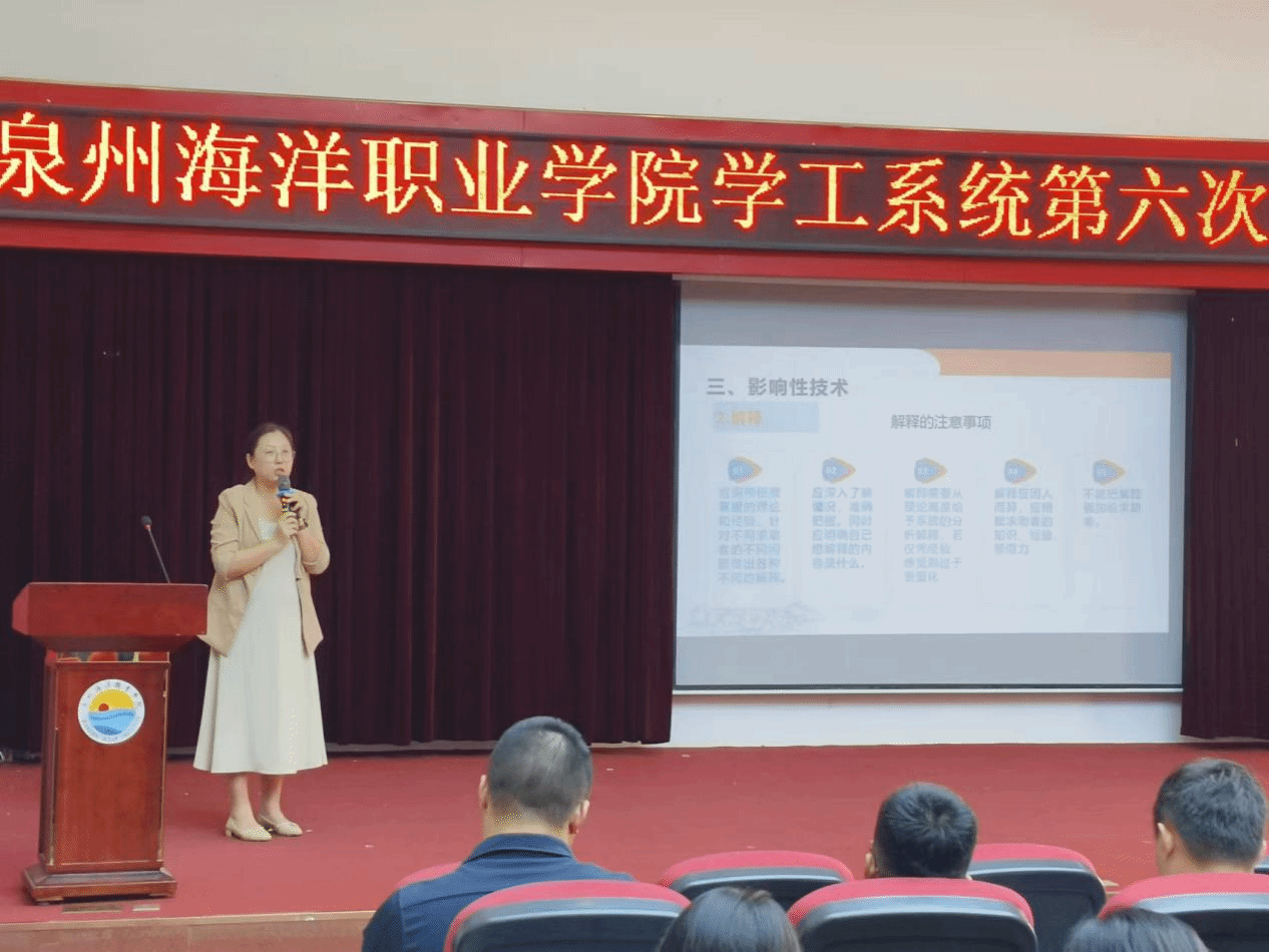10月22日下午,第六场学工系统心理健康专项技能培训在二号教学楼2204报告厅举行,全体学工系统成员参与培训。本次培训主题为《心理辅导基本理念与技术》,由心理中心副主任方秀莲老师主讲。