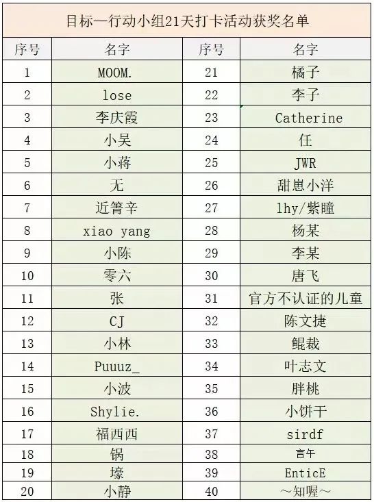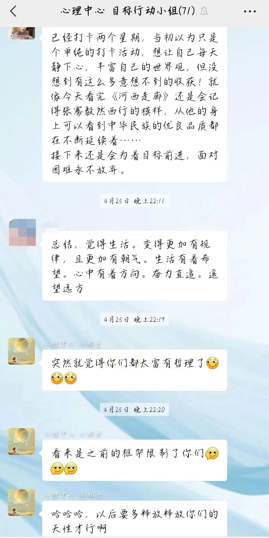 4月9日活动顺利拉开序幕,师生们积极参与为期21天的打卡活动,每天约有40名同学在群聊中接龙打卡,大家根据每日打卡的完成度对自己进行评分与总结,对第二天的目标和行动进行调整,并在每周的休息日,大家积极对自己一周打卡进行总结并展望下一周的打卡计划。活动过程中,大家不会因自己的目标渺小而感到羞愧,不会因今天没有很好的完成目标而心有不安,因为每一份坚持都被看见,每一个行动都值得肯定,我们都相信积跬步,以致千里。